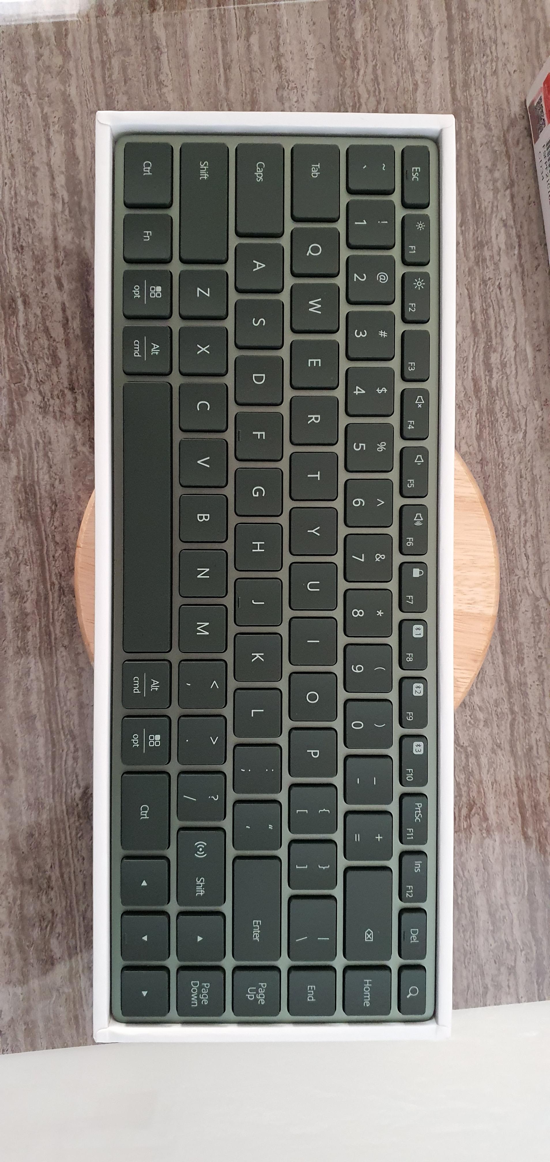 색상은 국방색에 가까웠다. 상판은 금속 재질이라 튼튼하고, 하판까지 금속은 아닌 듯 했다. 스펙상 무게가 320g, 애플 매직키보드는 390g. 구입 전 광고를 보고 알고는 있었지만 키스트로크가 매직키보드나 서피스키보드보다 2배는 긴 것 같다.