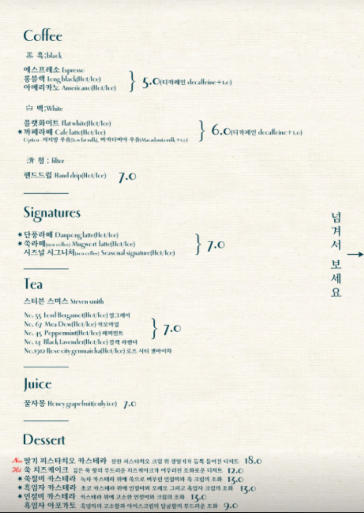 - 단풍라떼: 7,000원 (부드러운 크림과 베르가못 블랙티가 어우러진 달콤한 티라떼)