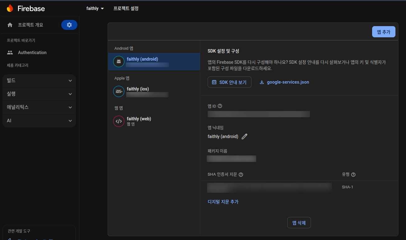 4. 위에서 확인된 SHA-1 지문을 firebase console의 프로젝트 설정 - 일반 탭으로 이동해서 화면 하단에 안드로이드 앱 선택 후 디지털 지문 추가를 클릭해서 SHA-1 지문을 붙여 넣는다.