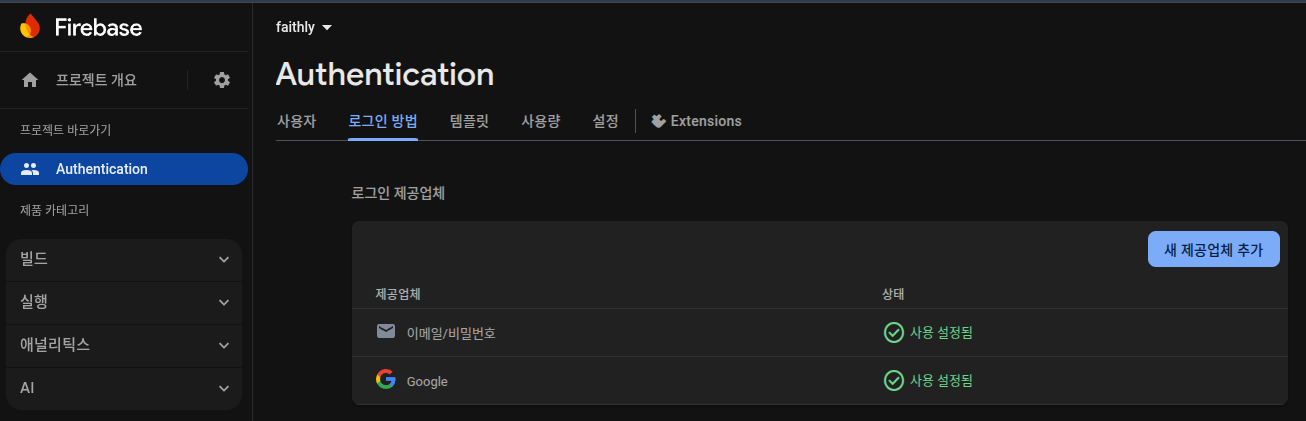 2. 제품 카테고리 - 빌드 - Authentication 에서 새 제공업체 추가 버튼을 클릭하며 사용할 로그인 방법들을 추가한다. 나는 일단 MVP를 구현 중이므로 이메일/비밀번호, 구글 로그인만 선택했다.
