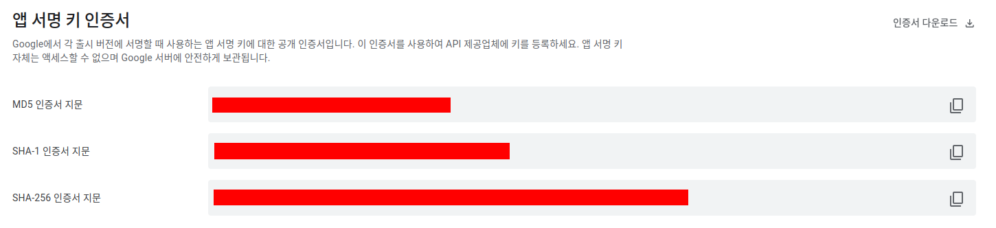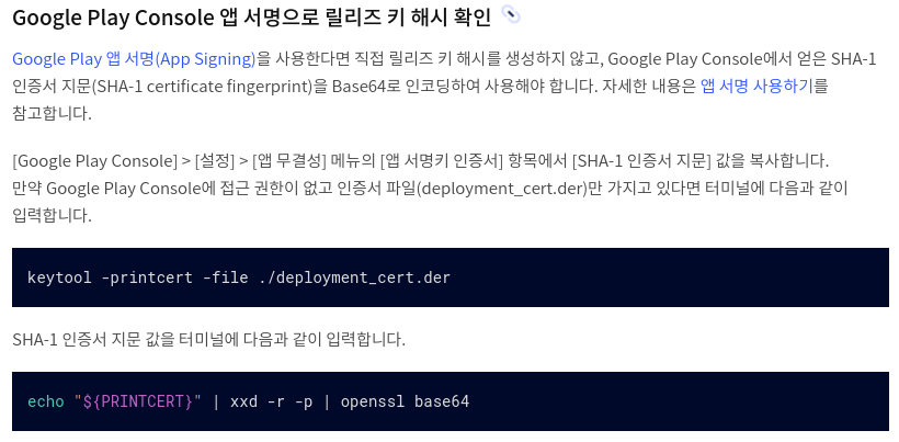 나는 구글 플레이 앱 서명을 통해 인증하는 방식을 사용했기에 Google Play Console의 앱 서명 페이지에서 앱 서명 키 인증서 - sha1 인증서 지문을 확인한 후 위 방법대로 base64로 인코딩해서 그걸 키해시에 등록해주면 된다.