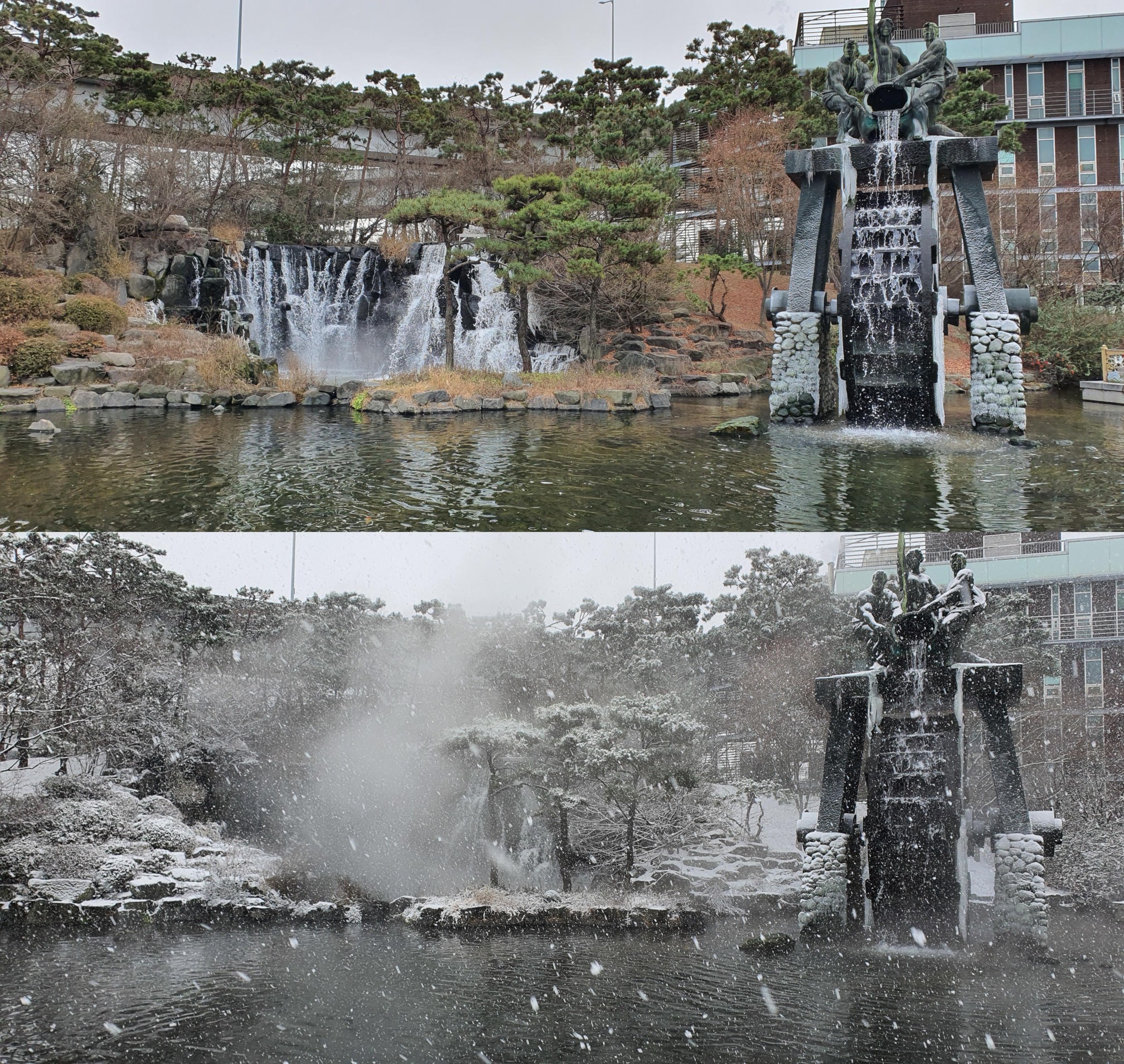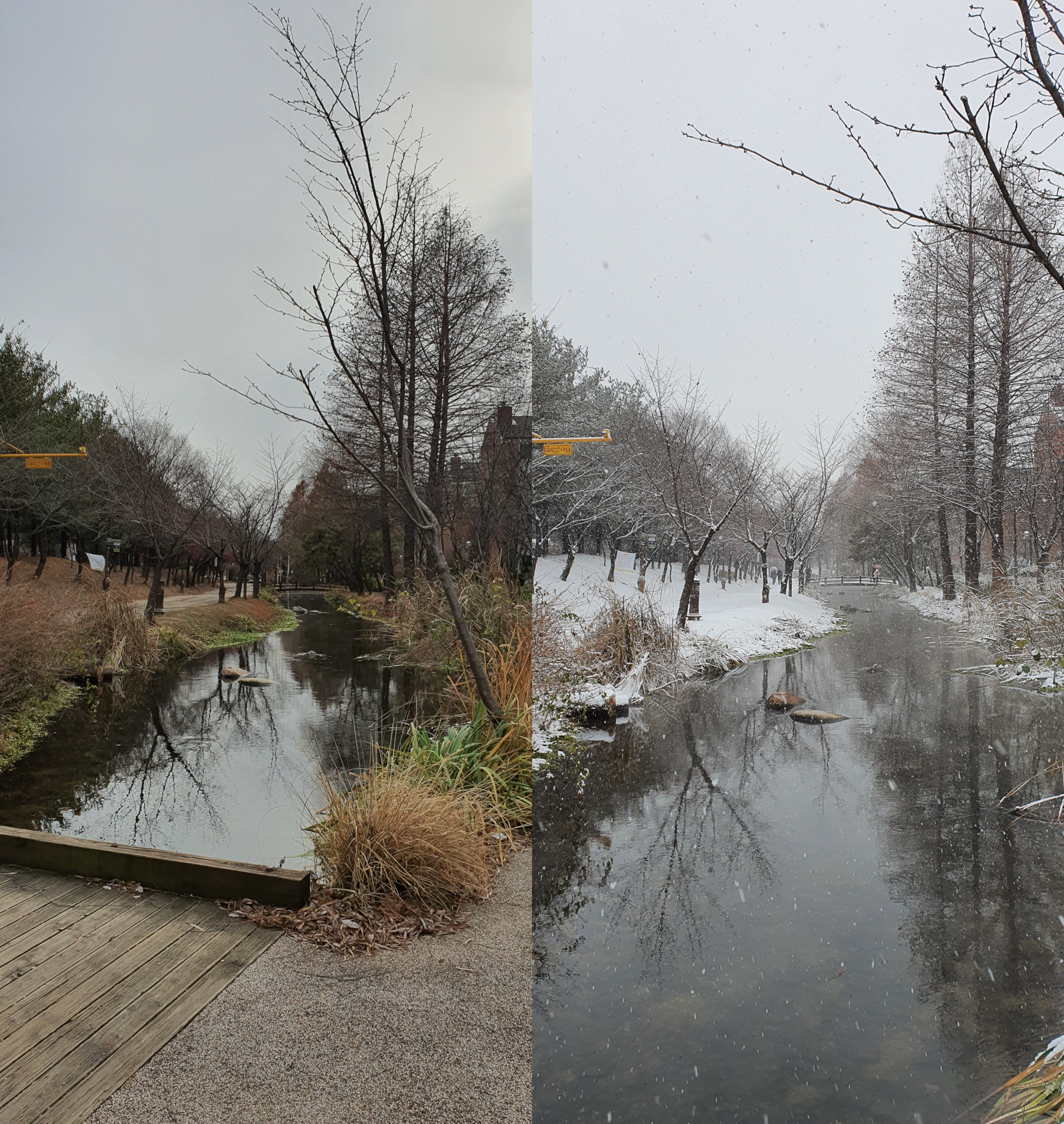 집 주변 산책 나왔을 땐 그냥 구름 낀 날씨 정도였는데 눈이 갑자기 쏟아지고 난 뒤 1시간 후 모습. 평소에 산책로 다닐 때 종종 사진을 찍는 편인데 그 덕에 이렇게 비교 사진도 찍을 수 있게 됐네.
