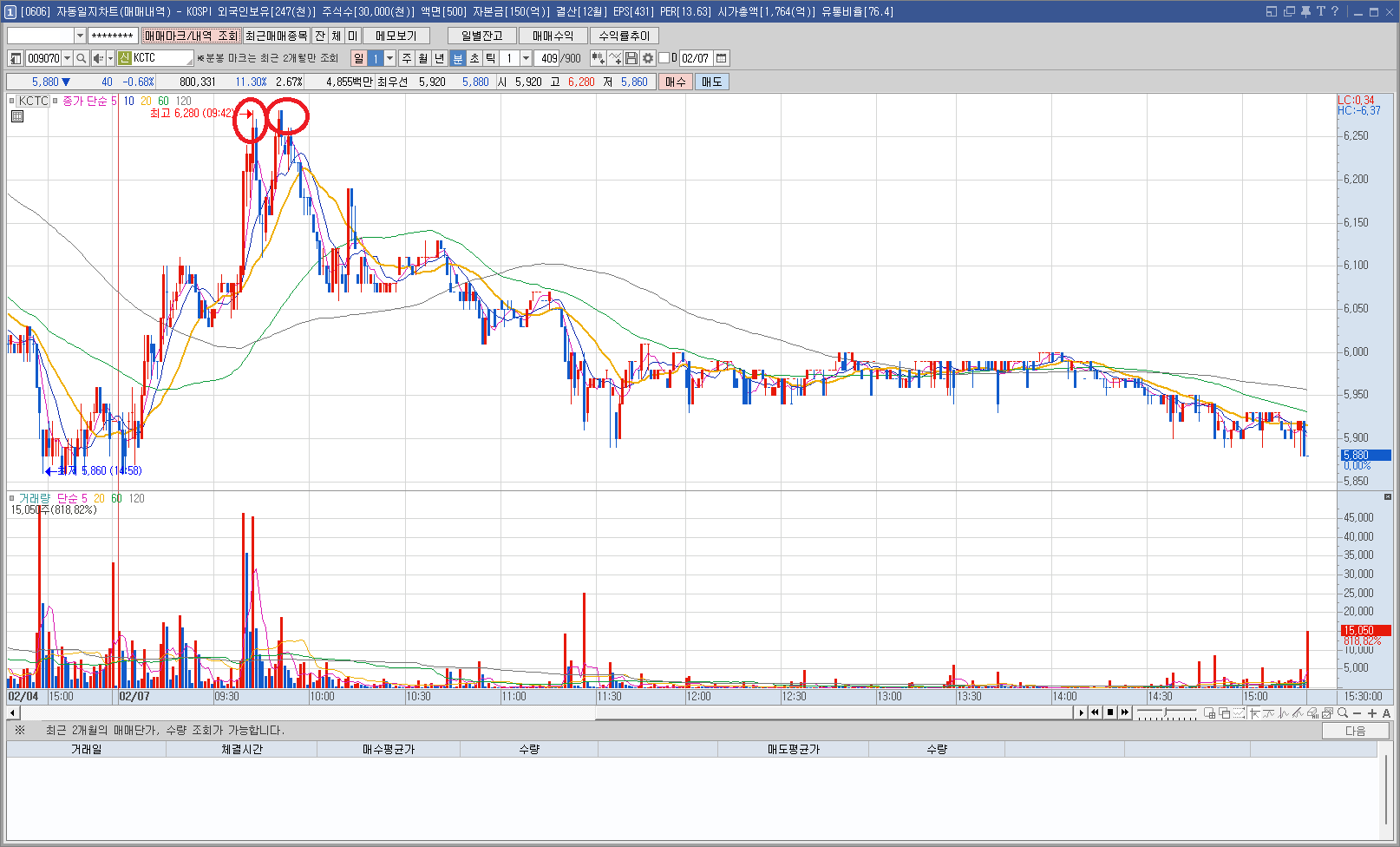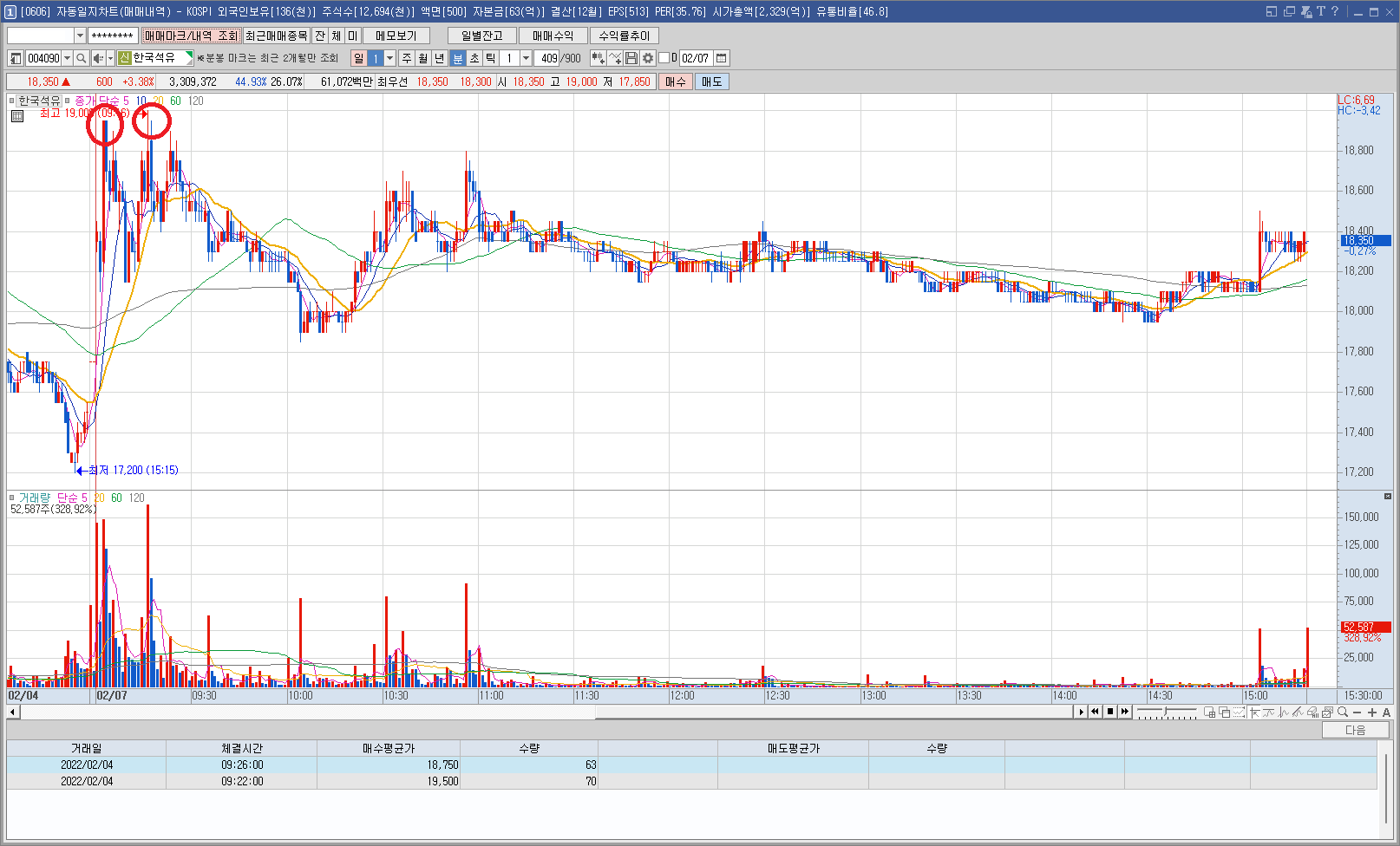 매매: 오늘 정리됐더라면 좋았을텐데 평단인 19,200원까지 도달하진 못했다. 장초반 첫 고점(첫번째 빨간원)에선 정리하지 못했어도 미리 그 라인에 절반이라도 매도 물량을 걸어놨어야 했는데 그냥 또 멀뚱멀뚱 쳐다보고 있으면서 아무것도 안하고 있다고 정리할 기회(두번째 빨간원)를 놓쳐버리고 말았다ㅠㅠ 언제쯤 이게 흐리멍텅한 자세가 고쳐질런지 에휴~~ㅠㅠ