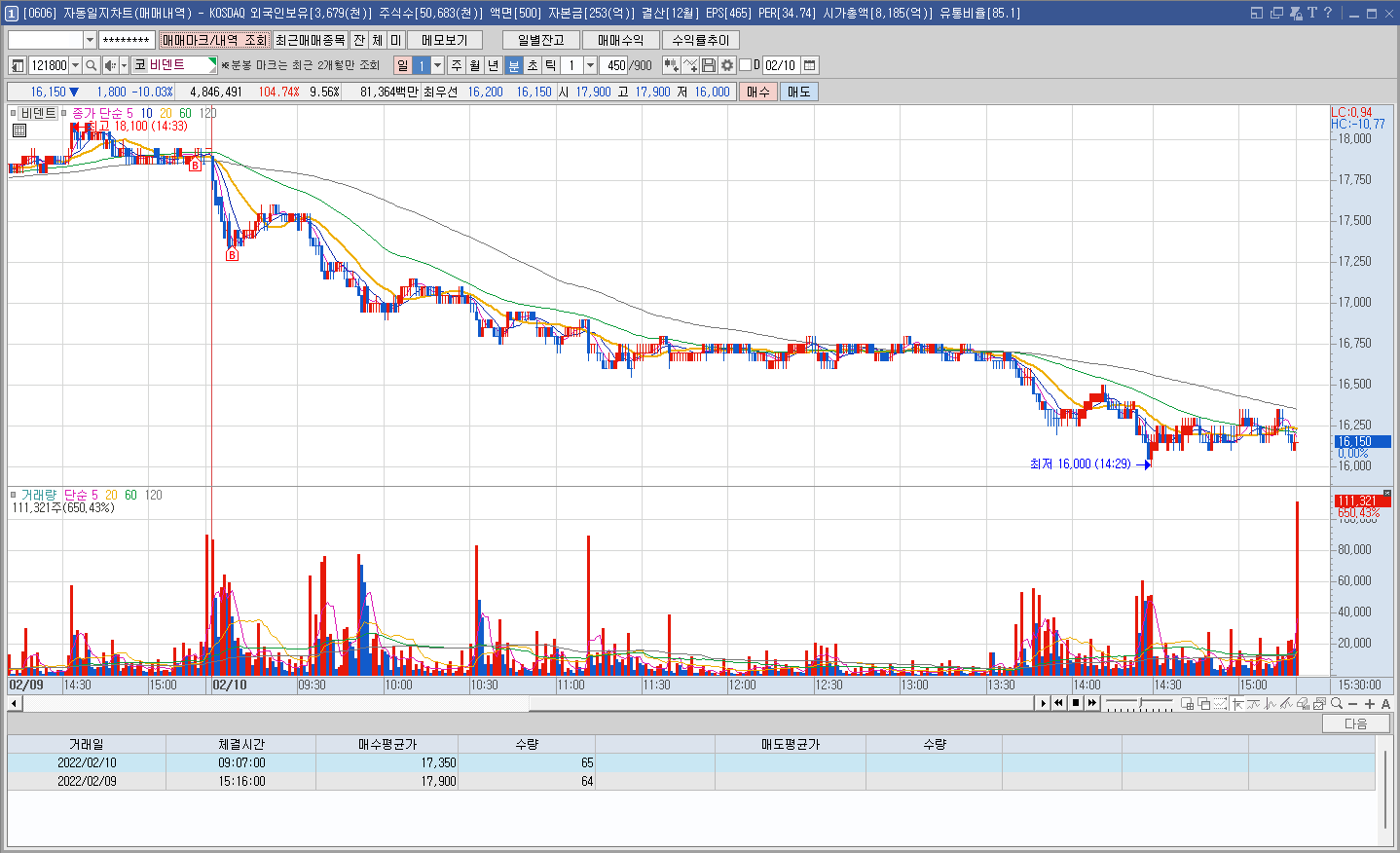 내용: 2월 4일 일봉상 20일선을 돌파한 이후로 많이 빠지지 않고 옆으로 횡보하는 모습에 일단 들고는 있다. 근데 지금처럼 곧 튈것처럼 하면서 저렇게 조금씩 조금씩 빠지면서 애매하게 움직인다면 팔지 말지를 고민하게 된다. 이미 손실이 큰데 좀 더 버틸지 그냥 내일까지 보고 던져 버릴지 결정해야 할 것 같다.