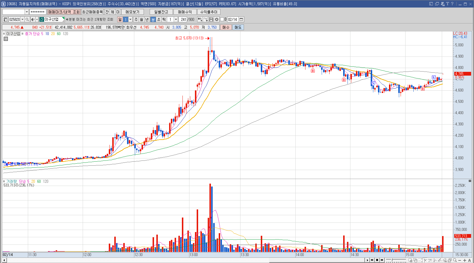 하지만 다시 20분선을 위로 기어올라와 안착하는 모습에 바로 4,640원에 진입, 곧 상승하다가 60분선에서 살짝 머뭇거리는 모습에 전량 정리. 짱돌을 한번 맞으니 언제라도 또 날아올까봐 버티질 못하겠다.