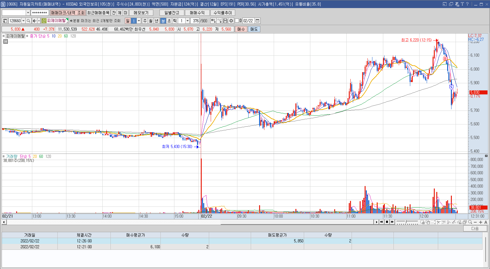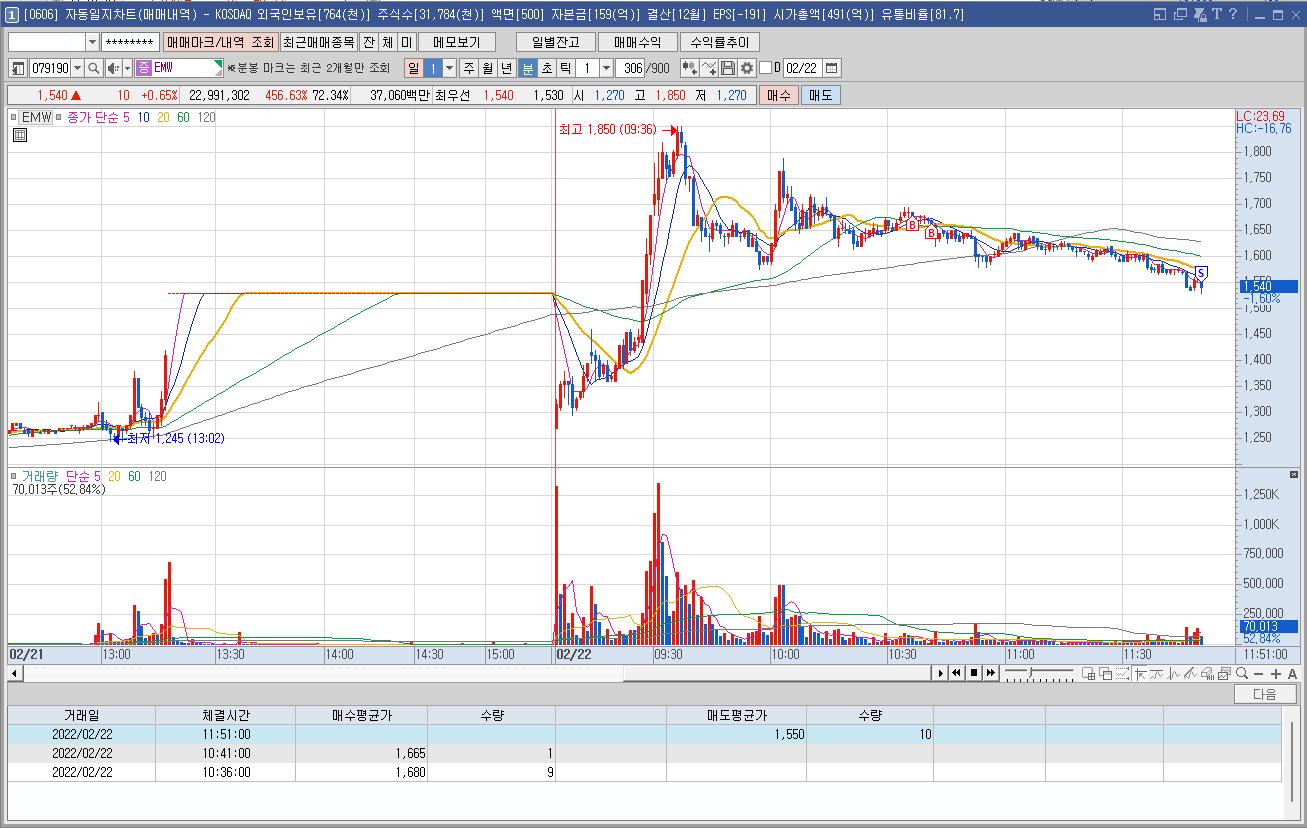 매수 사유: 공기아연전기 개발로 어제 상한가를 갔으나 공시를 통해 관련 없음을 알렸음에도 불구하고 오늘도 강한 움직임을 보이는 모습에 뭔가 있는건가 싶어서 계속된 큰 손절에 그냥 홧김에 들어갔다!