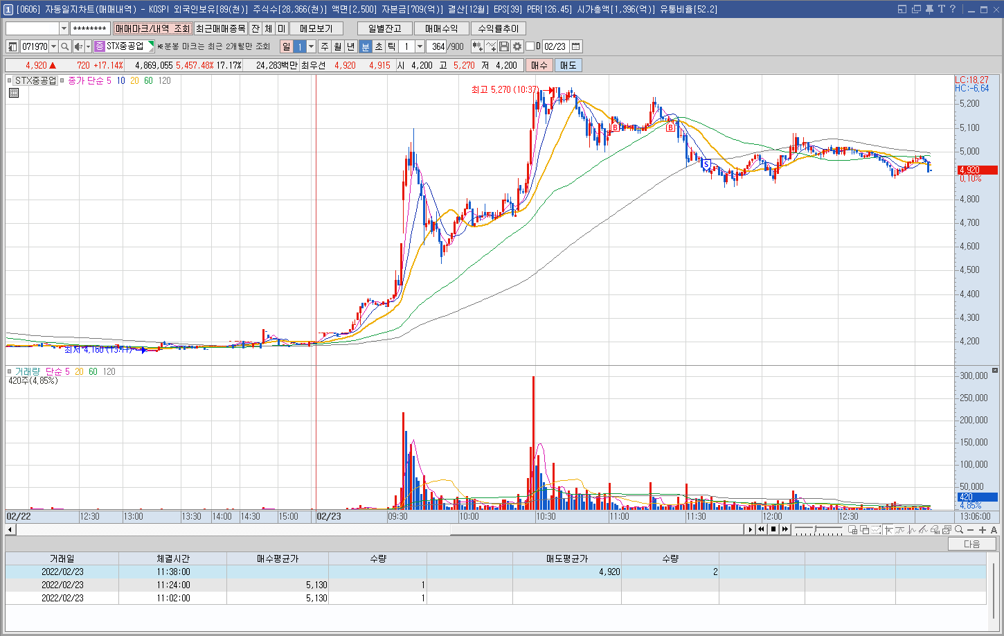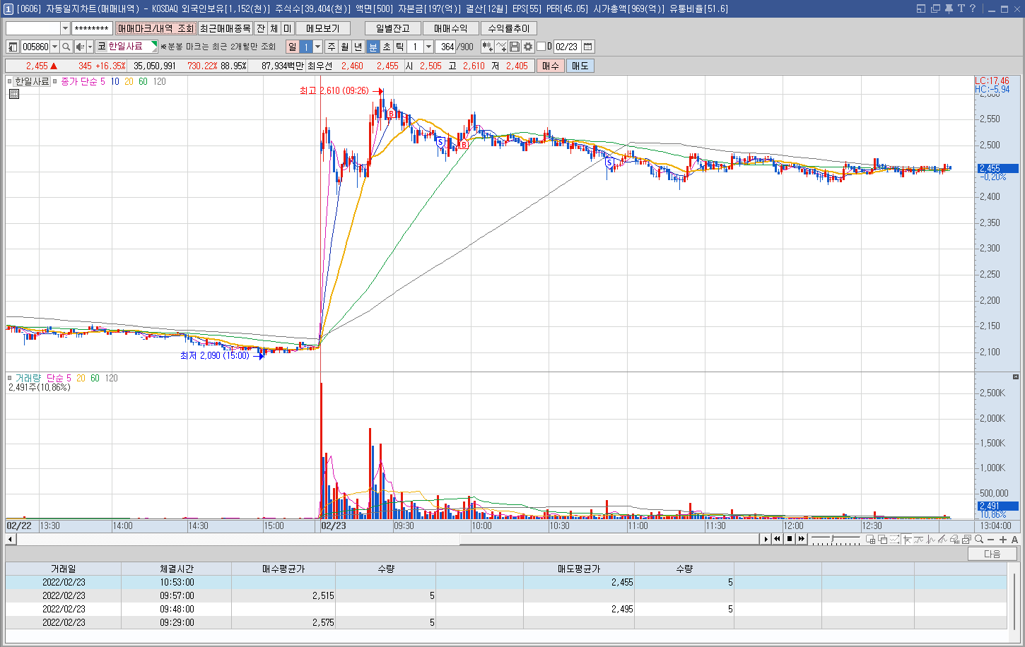 내용: 될수록 매수를 20% 이상일때는 하지말자고 했는데 계속 같은 실수를 반복한다. 첫 매수도 20% 위에서 잡았고 잡은 뒤로도 큰 갭상으로 출발한터라 급락할까봐 불안했는데 역시나 큰 갭상 이후 하락하는 모습에 1차는 손절. 다시 1분봉상 20분선을 돌파하는 모습에 바로 매수했으나 직전 고점까지는 갈거라 생각하고 버텼는데 다시 하락하는 모습에 또 손절ㅠㅠ 오전장 매매를 하면 안되는건가? 오전장 매매는 거의 실패다. 그렇다고 오후장을 잘하는 것도 아니지만.