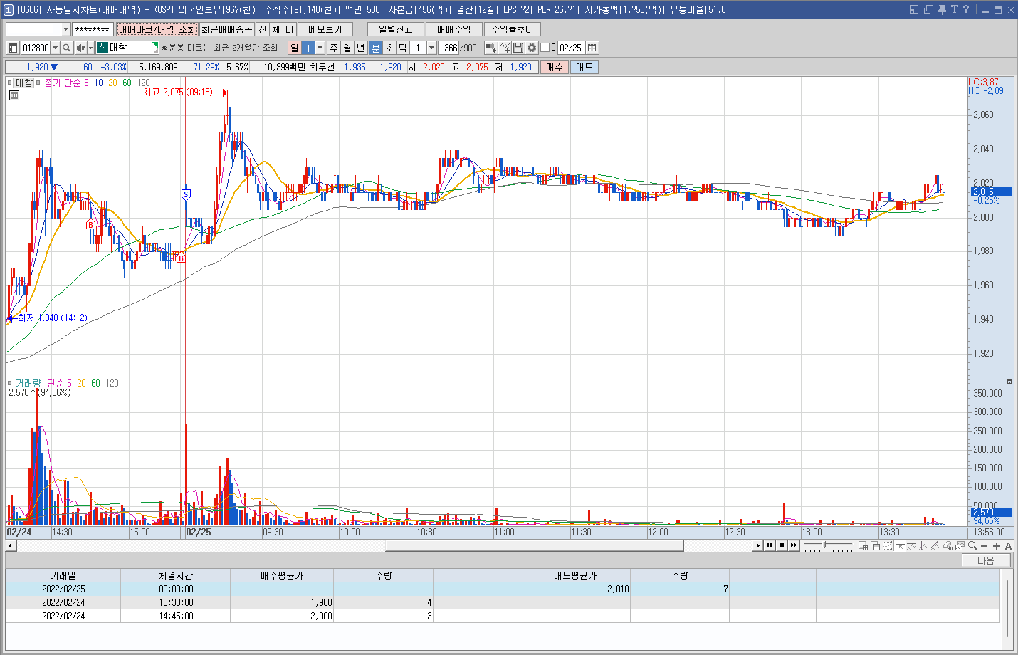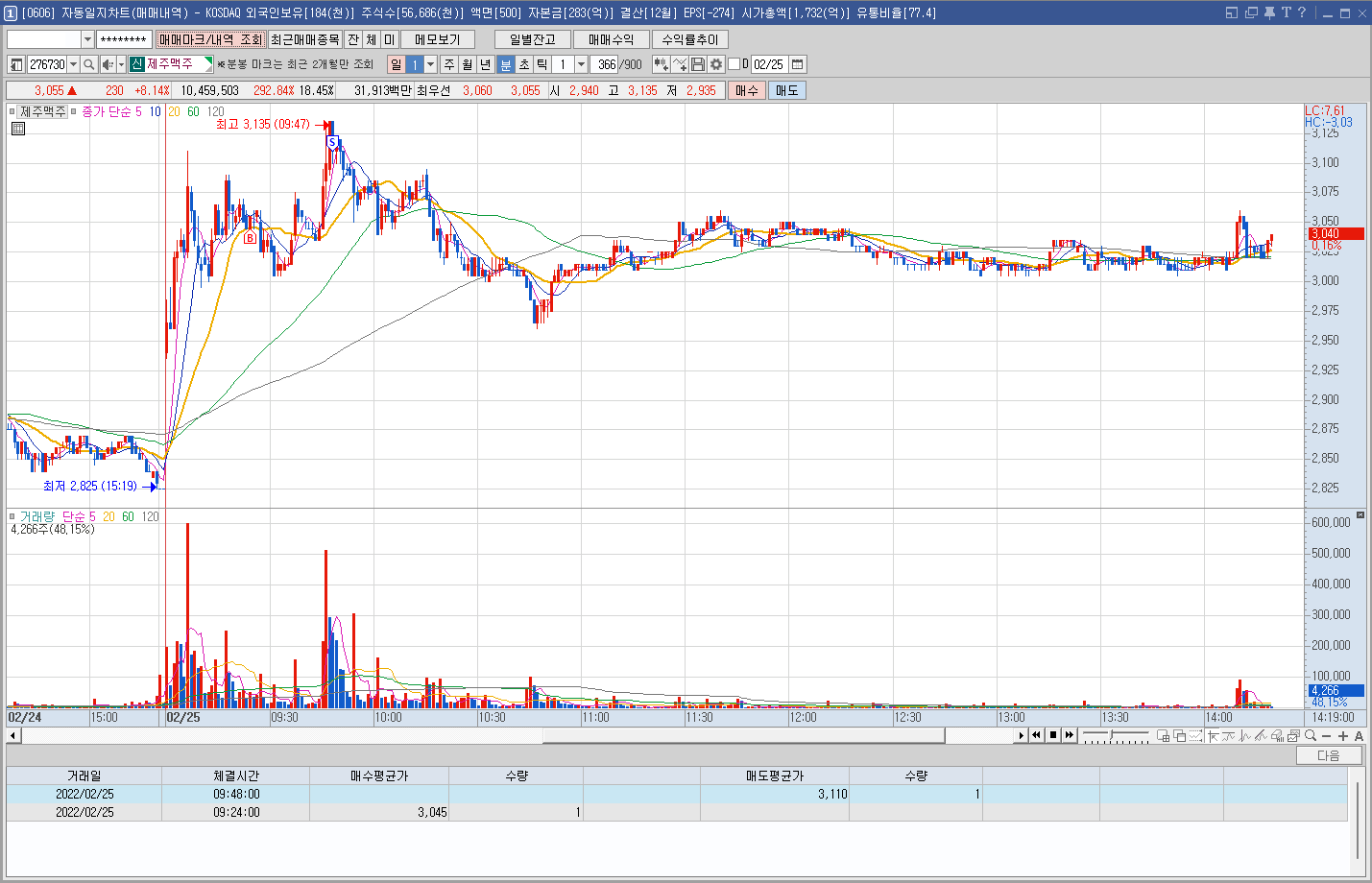 내용: 어제 장막판에 잡아 들고 온 종목으로 장초반 살짝 갭을 띄워 출발했으나 왠지 첫 캔들을 음봉으로 만들 것 같은 느낌에 바로 정리.