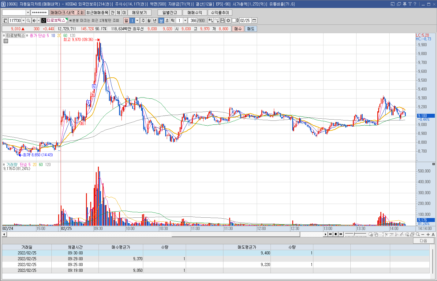 내용: 어제 미리 생각했던 방법대로 조건검색창에 올라오는 종목들을 빠르게 스캔했고 그 가운데 로봇 관련주들이 많다라는 게 눈에 들어왔고 그 중 1분봉, 3분봉상 좋은 위치에 가 있어 진입.