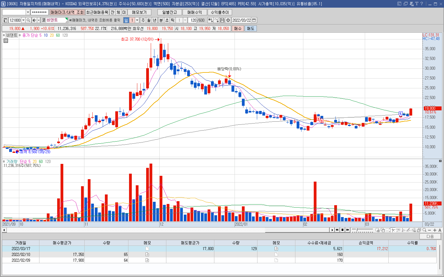 내용: 이건 오늘 매매한 종목은 아니고 한달 넘게 홀딩하고 있다가 생각보다 횡보가 길어지는 모습에 지난주에 정리했는데 오늘 갑작스런 호재로 10%대 급등을 보여줬다. 3거래일만 더 버텼다면 10%를 먹을수 있었는데 너무 아쉽다. 종목 선정은 나쁘지 않았는데. 2번에 걸쳐 분할 매수를 했는데 분할 매수도 전략을 세워서 해야할 듯 하다. 첫 매수가보다 떨어졌다가 바로 추가 매수를 할 게 아니라 어느 지점까지 하락하면 추가 매수하겠다 이런 전략이 필요할 듯 하다.