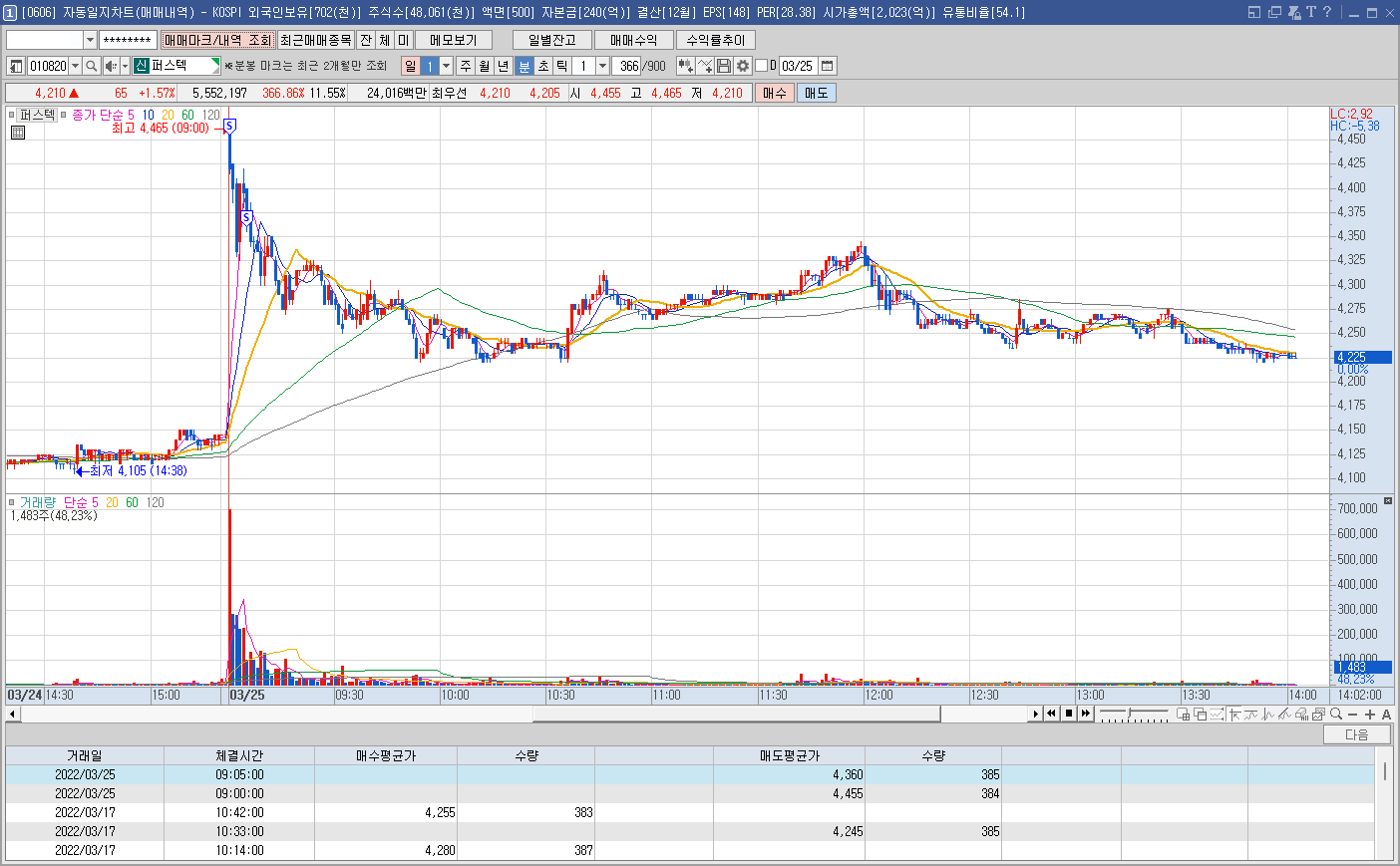 내용: 로봇 테마로 엮였다면 오늘도 별 볼일 없었겠지만 어제 북한이 또 미사일을 쏘는 바람에 시초에 갭상을 하는 바람에 시초에 절반 털고, 나머지는 더 상승하면 정리하려고 했으나 아래로 흐를듯한 모습에 그냥 나머지도 정리.