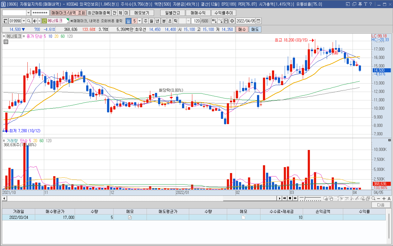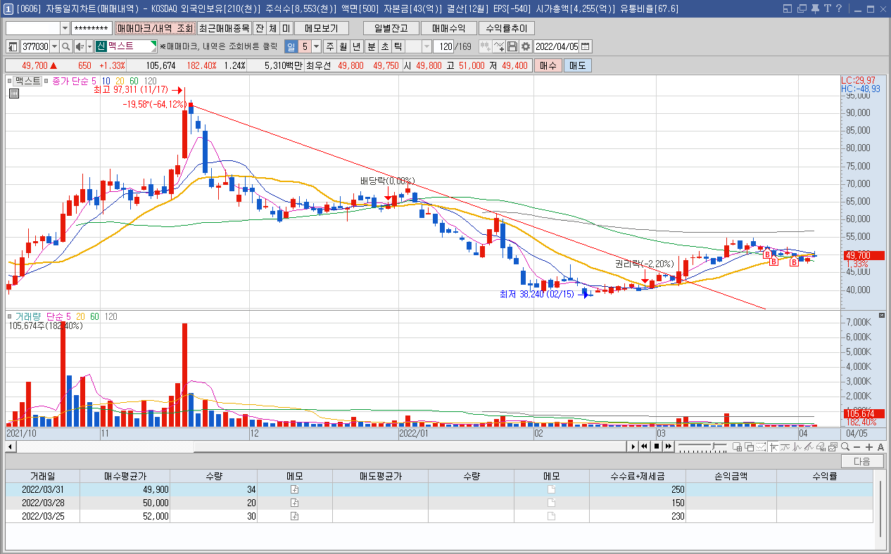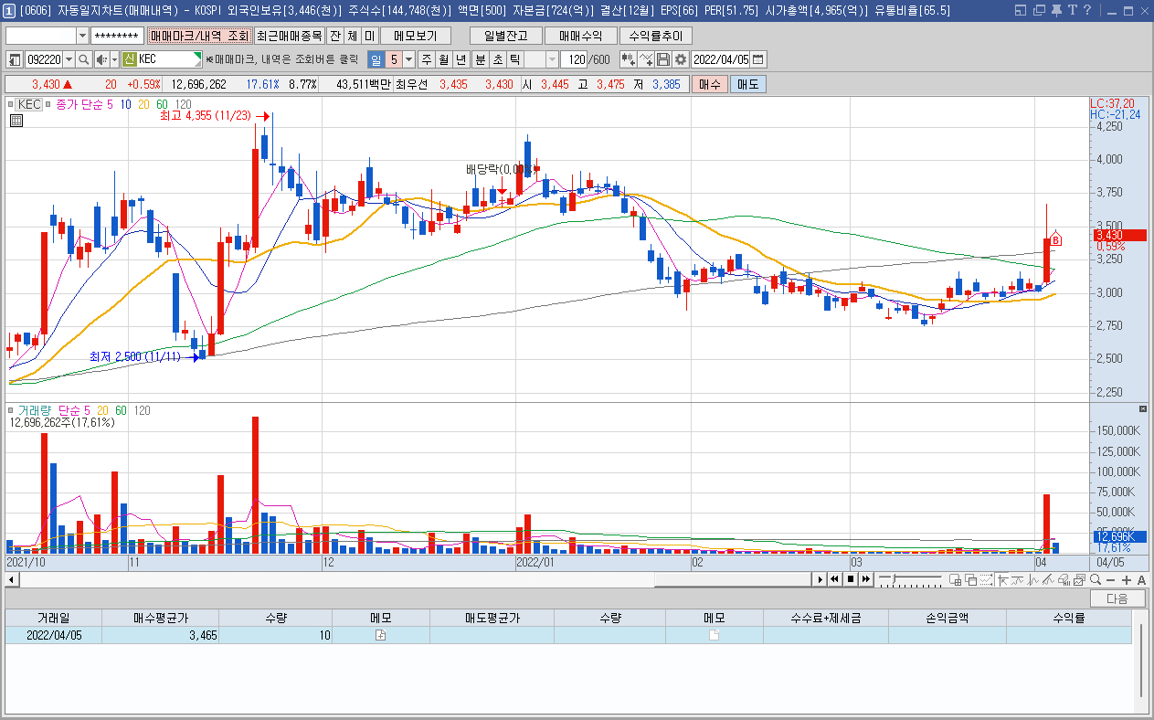 매수 사유: 3월중 분홍색 원에 표시된 것처럼 의미있는 거래량이 발생되어 세력의 매집 흔적인지 의심되어 진입.
