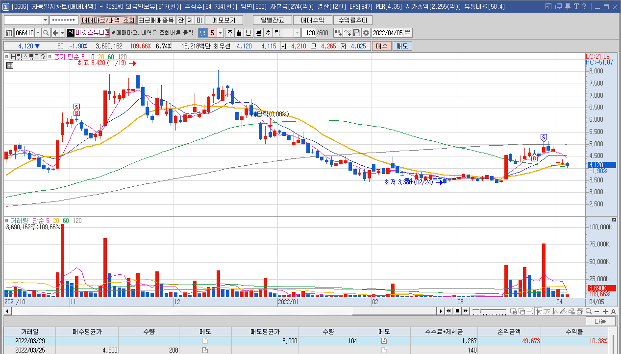 매수 사유: 직전 저점 라인까지 내려와 있어 분할 매수 관점으로 볼 때 한번 진입해볼수 있다고 판단. 과거 메타버스 대장주로 급등하는 모습을 보여준 적이 있어 다시 메타버스 테마가 관심을 받을 때 시세를 줄 수도 있을거라 판단.