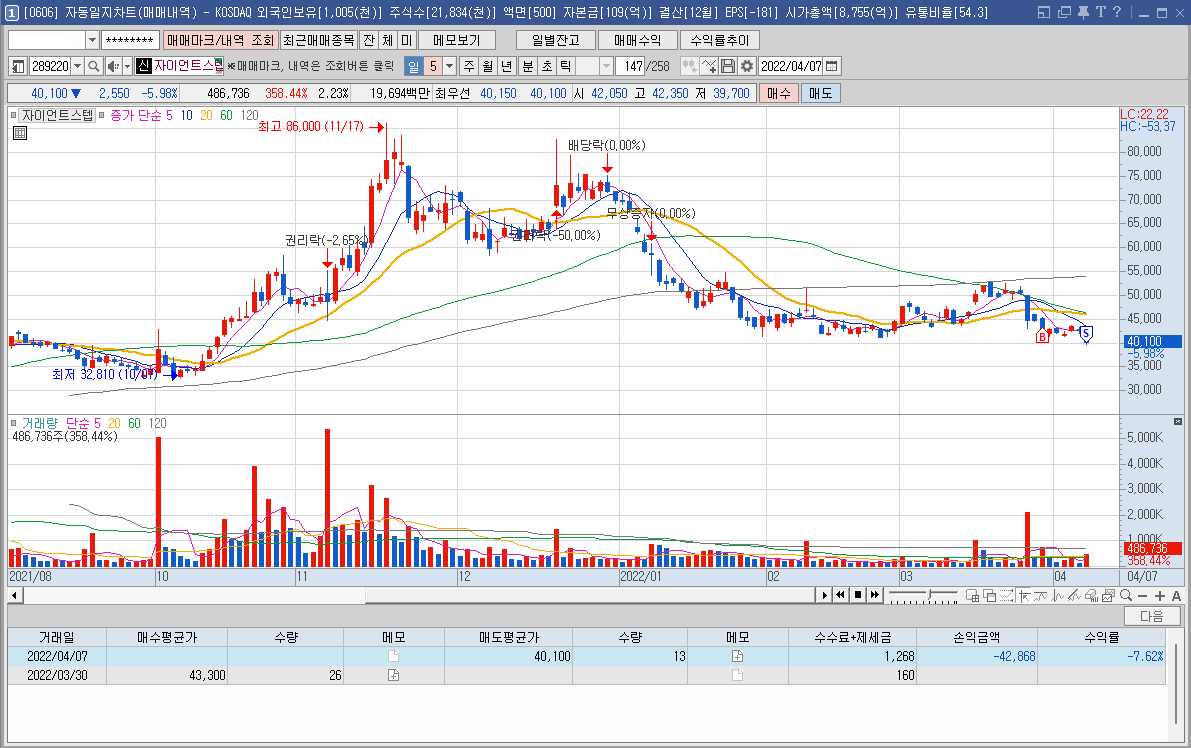 내용: 지수를 이길 순 없다고 전체적으로 다시 하락장이 시작된 모습에 개별 종목도 맥을 못추고 무너지는 모습. 너무 성급하게 들어가기도 했다.