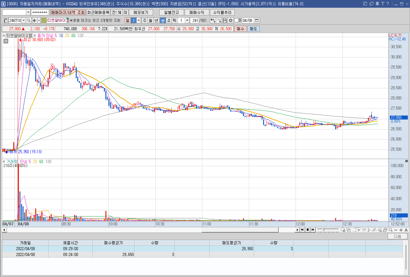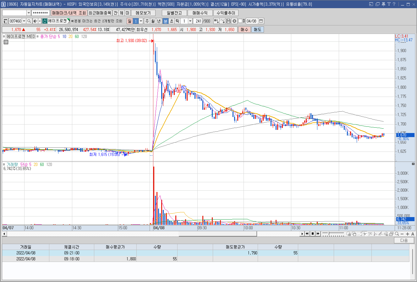 매수 사유: 위 종목과 마찬가지로 어제 시간외 급등 종목. 눌렸다 반등해서 운좋으면 상한가를 먹겠다는 전략.