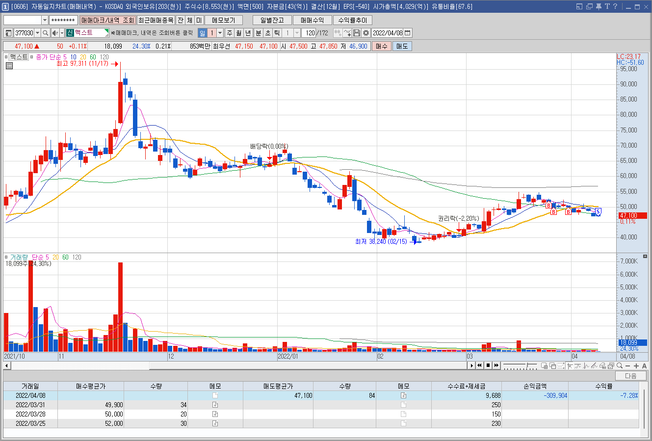 내용: 내가 본 게 매집봉이 아니었다. 매집봉이라 판단되려면 적어도 지난 11월 중순처럼 700만주 정도는 터져줘야 하는데 살짝 삐죽 나온걸보고 매집봉이라 생각했으니. 그렇게 보고 싶었나보다. 비중도 크게 실었는데 실패했다.