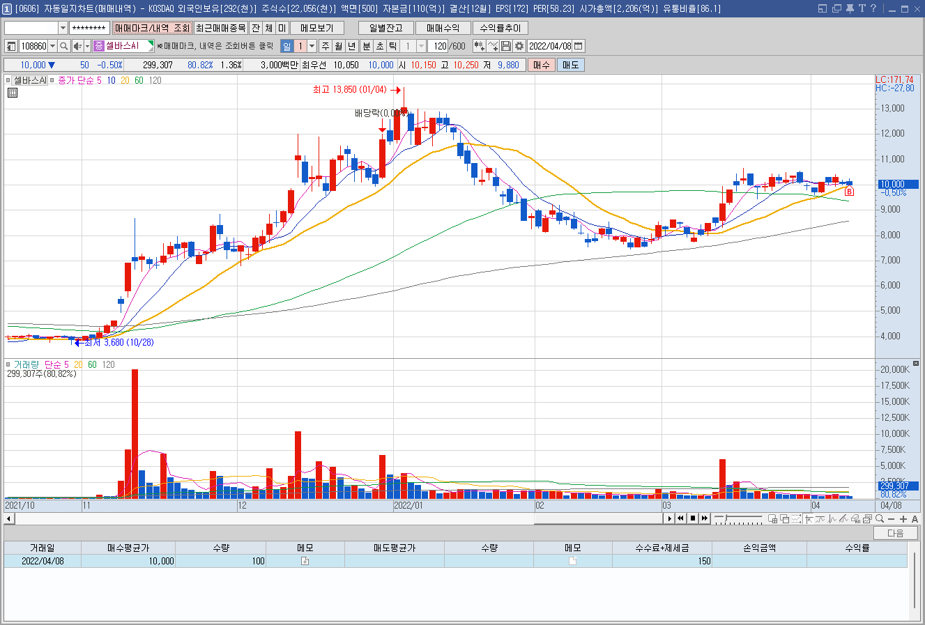 손절 라인: 9,500원에 추가 매수, 일봉상 120선 이탈시 정리.