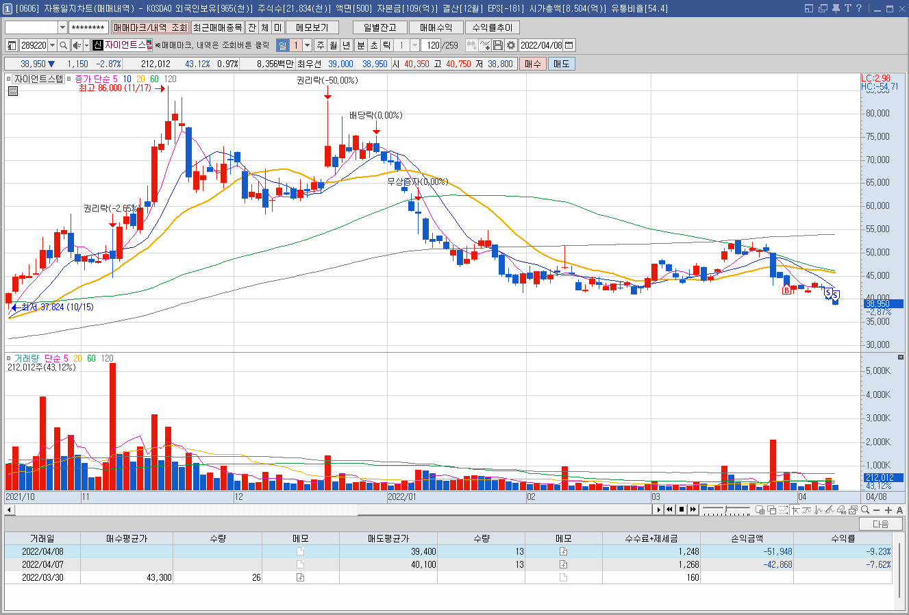 매수 사유: 메타버스 관련주로 충분히 조정받았고, 3월초 중순에 약하게 매집봉이라고 생각했던 거래량이 나와 진입.