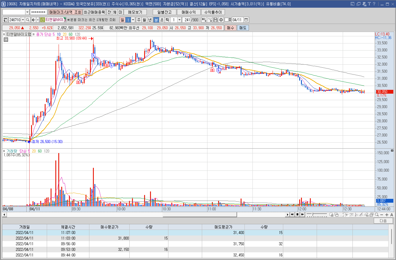 내용: 글로벌 기업 회장과의 미팅이라는 뉴스에 과거 바이오 3D 프린트 기술때문에 관심을 갖고 있나 싶어 장초반 한차례 시세 이후 조정 받을때까지 기다렸다가 직전 저점 구간에 매수. 5%때 절반 익절 후 다시 눌리는 타이밍에 추매. 하지만 황금선 밑으로 빠지는 모습에 전부 정리. 조금만 더 여유를 뒀다면 더 큰 상승이 있었는데 아쉽다ㅠ 이후 한번 더 매매했으나 약손절로 정리.