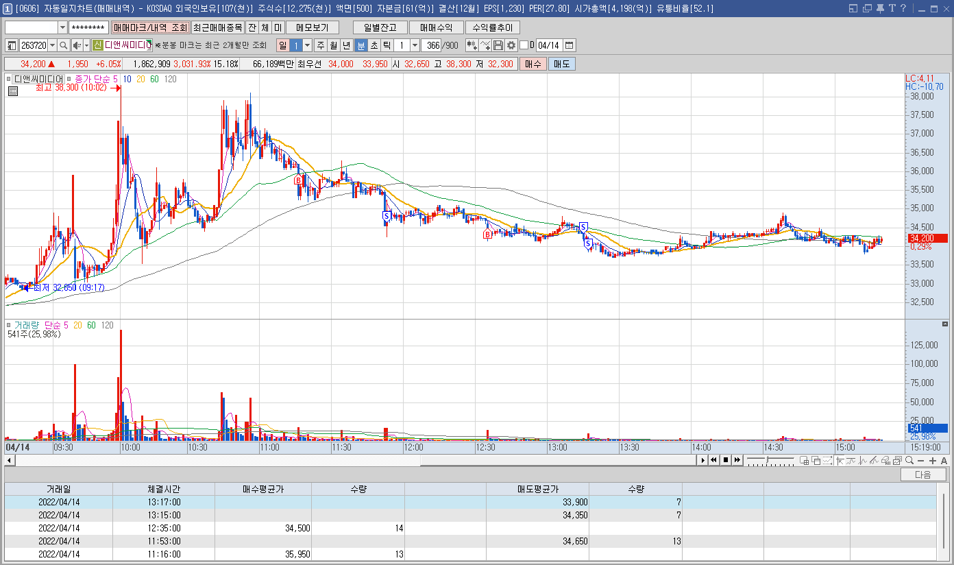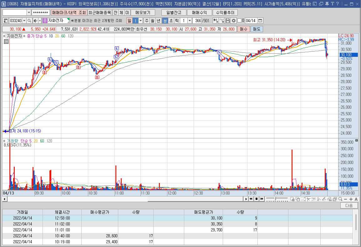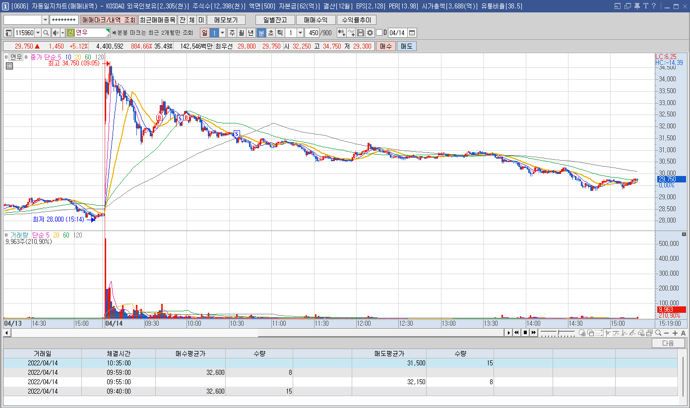 내용: 오늘 상승폭에 비해 큰 수익을 내진 못했지만 적절한 타점에 매매한 듯 하다. 다만 마지막 개미털기에 당한 매도는 좀 아쉽다.