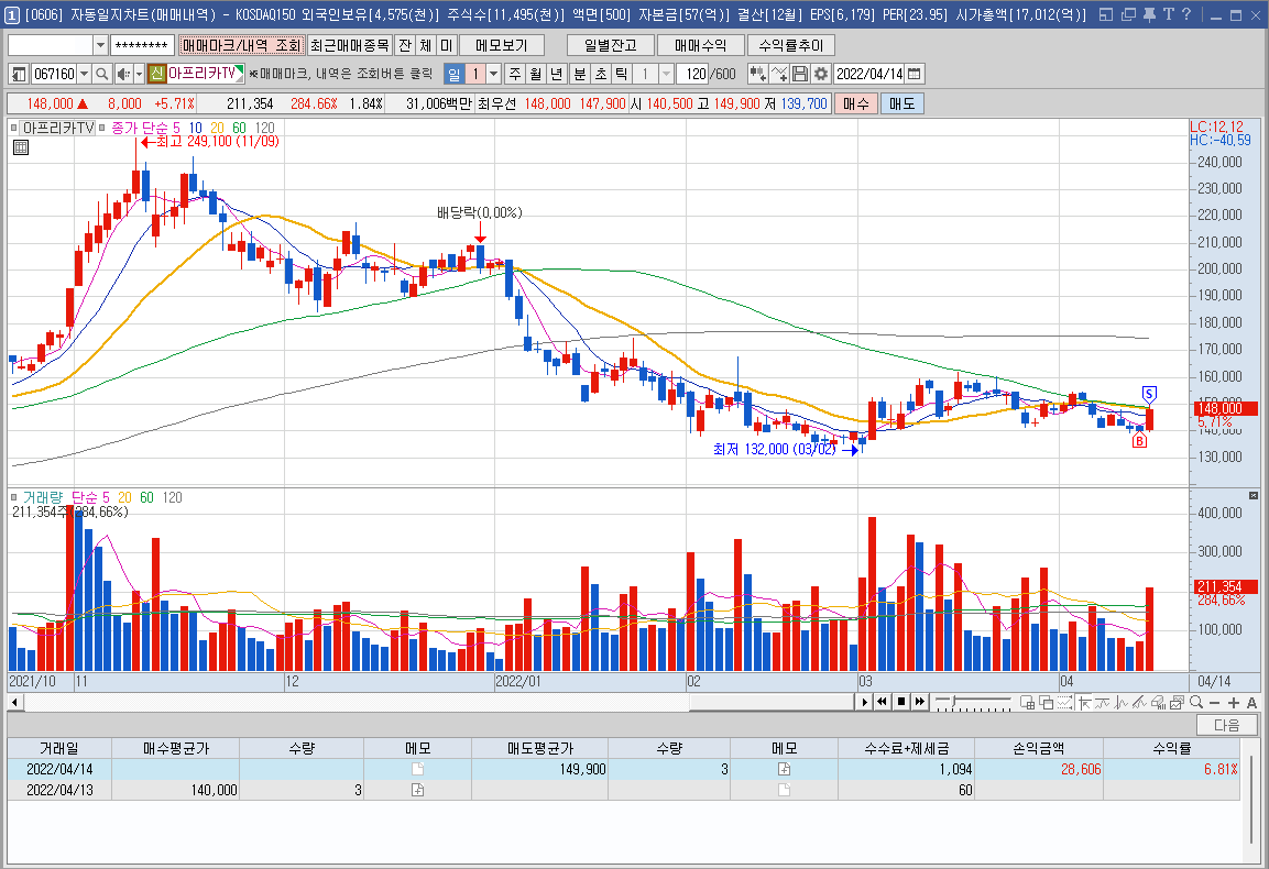 내용: 60주선에 터치되면 시그널이 뜨도록 설정해놓고 어제 시그널이 뜨는 모습에 14만원에 진입. 일봉상 240일선에 터치되면 던질 생각이었고 오늘 급등하여 240일선(150,400원)에 근접하는 모습과 15만원에 매물이 쌓여있는 것을 보고 그 직전인 14.9만원에 전량 매도. 결국 장중 최고점 매도^^ 역시 욕심을 부리지 않으니 수익이 나는구만^^