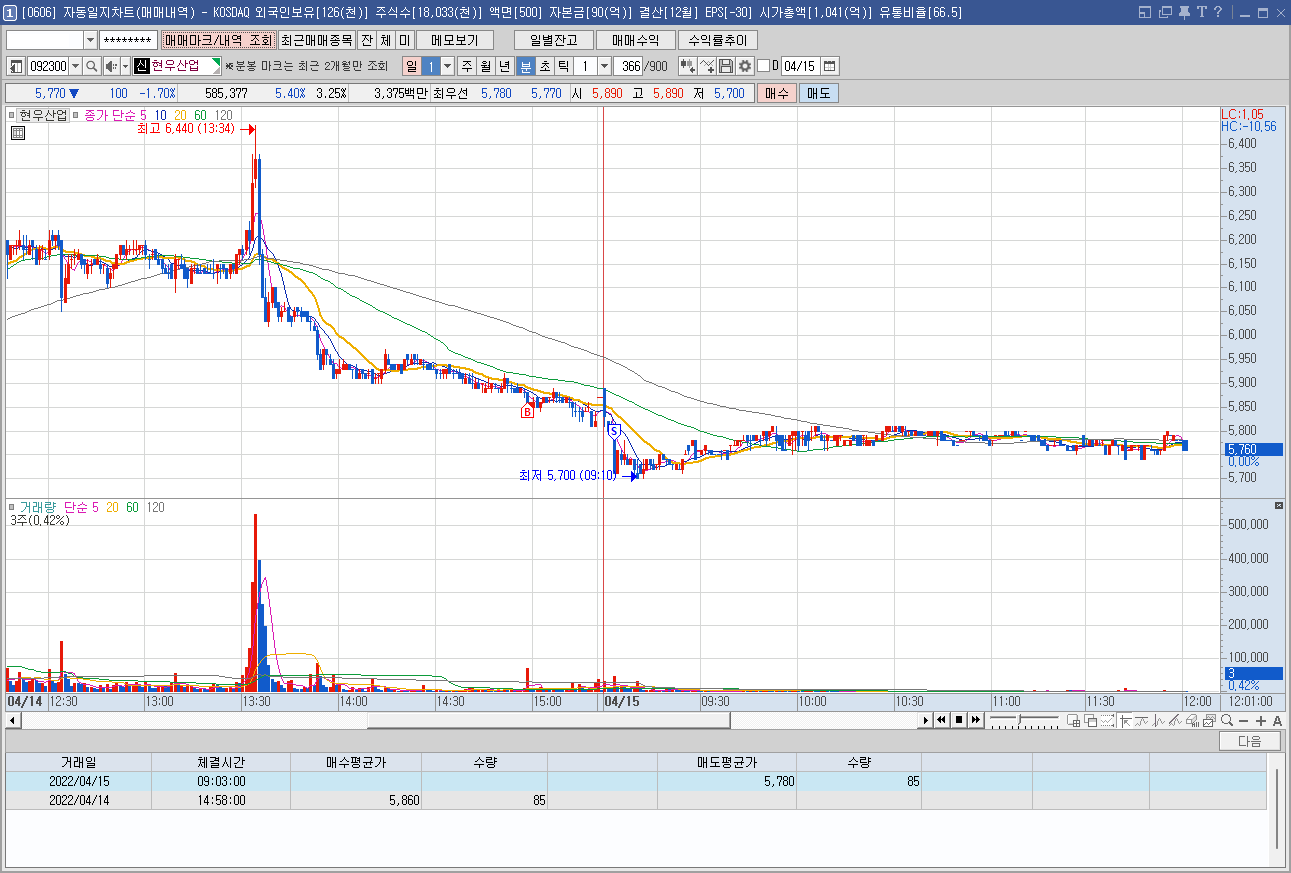 매수 사유: 이번주 애플카 이슈가 다시 한번 불거지면서 애플카 관련주들이 시세를 보여줌. 현우산업도 어제 피뢰침을 쏘는 모습에 어제 장막판에 진입.