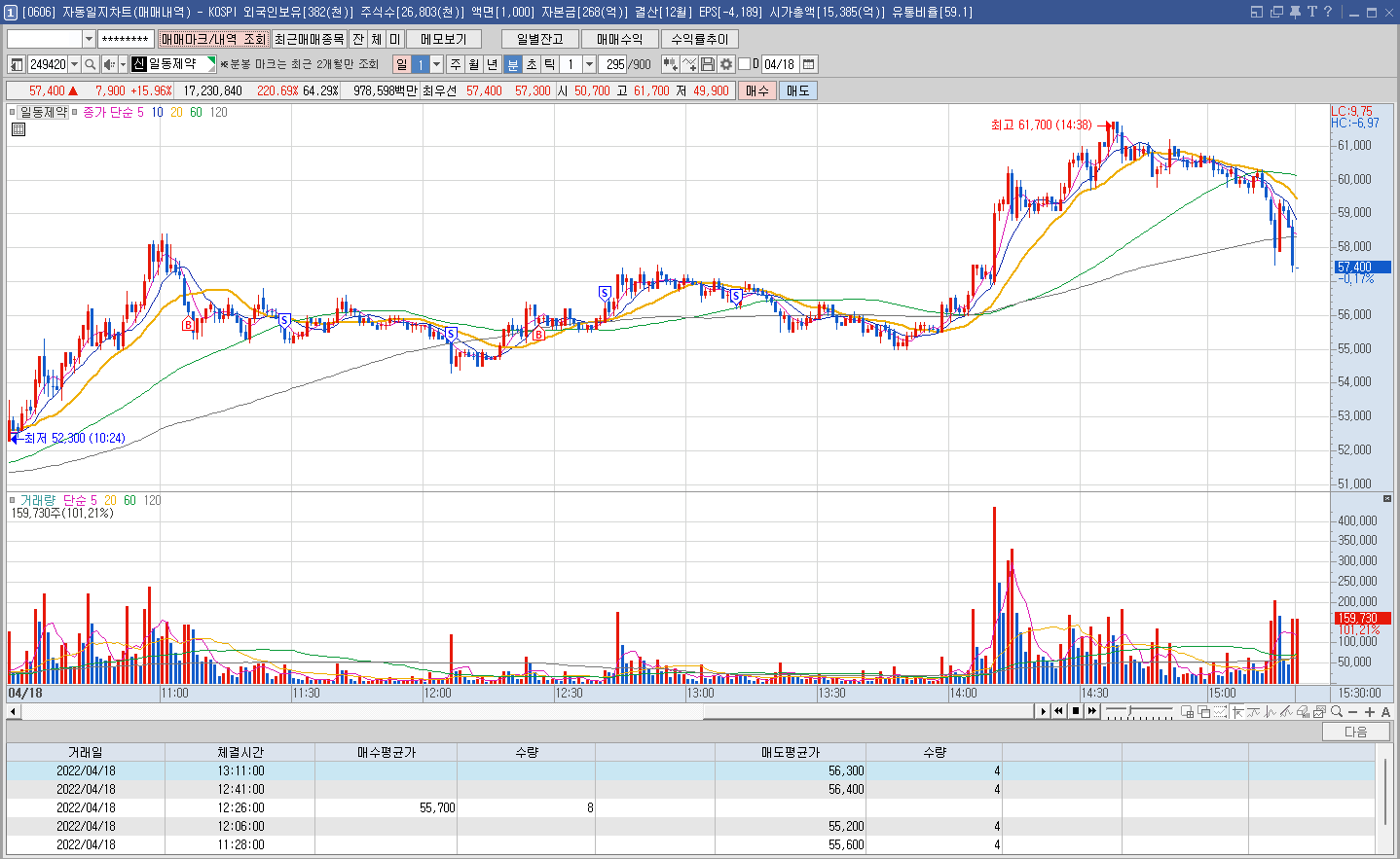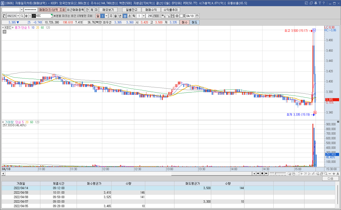 내용: 물려 있었는데 장 끝나기 직전 갑자기 프로그램 매수가 들어오면서 급등. 장중 거의 꼭대기에서 절반 매도. 전량 정리하지 않은 이유는 일봉상 3월초 급등 이후 그 캔들의 중간 라인에서 지지받고 반등하는 모습에 조금 더 지켜보기로 했음. 다시 단기적으로 상승 추세를 타는 모습에 장중 거의 최저점에 추가 매수. 이건 타이밍 하나만큼은 기가 막혔다^^ 매일 이렇다면 얼마나 좋을까.