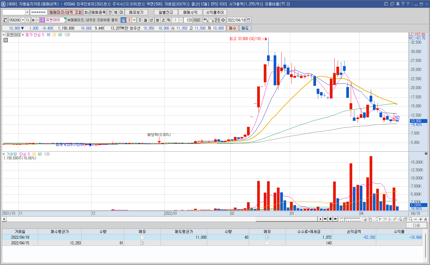 내용: 아침에 날 슬프게 했던 종목. 물론 먹기 했지만 아주 나이스하게 매매할 수 없었다. 병원 진료본다고 병원에 있었기에. 물론 HTS 앞에 있었다고 해서 최고점에 팔았을 거란 보장은 없지만 매도가와 최고가와의 격차가 꽤 나다보니 아쉬울수 밖에 없다. 내가 볼 수 있을 때 좀 움직여주지 ㅠㅠ