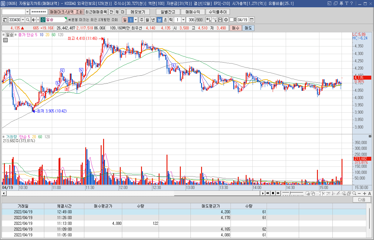 내용: 그래도 얘는 어제와는 다르게 횡보할때 답답하다고 정리하진 않았네. 마지막 매도 물량은 좀 더 버텼으면 더 좋았을텐데 아쉽다. 지금보니 당일 전고점을 돌파했었네ㅠㅠ 이럴땐 먹고도 아쉽다. 도대체 언제쯤 10% 이상씩 먹을 수 있을까?