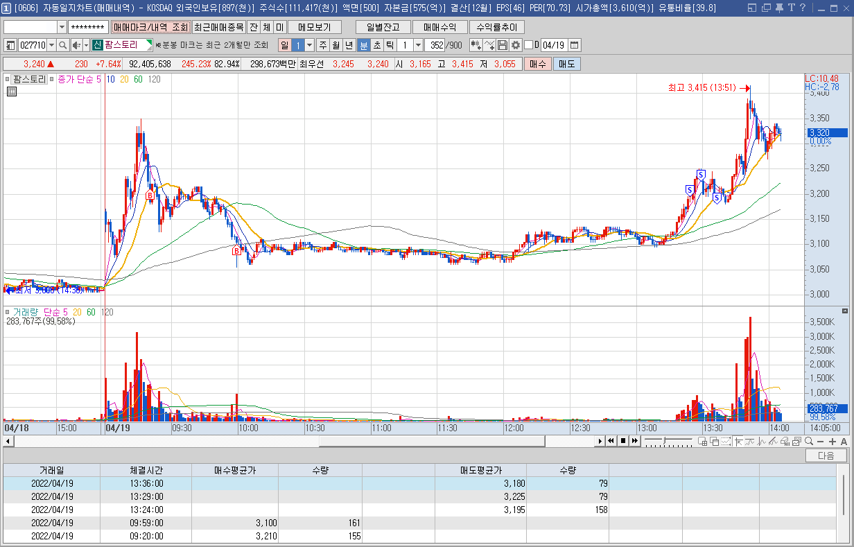 내용: 매수 타이밍이 좀 늦었다. 1분봉상 황금선을 돌파했을 때 진입했다면 좀 더 버티면서 크게 먹었을 것 같은데 결과적으로 많이 아쉬운 매매다. 그러고보니 요즘 오전 10시 반 이후부터 대략 12시~1시까지 횡보를 유지하다가 급등하는 경우가 많이 보이는 것다. 하향이 아닌 횡보하는 경우라면 좀 더 버텨볼 필요도 있는 것 같다.