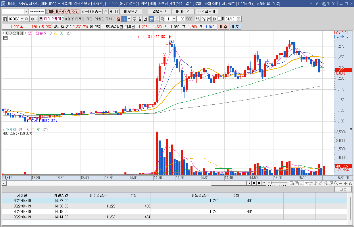 내용: 매수 1분봉상 황금선을 이탈했으면 바로 손절했어야 했는데 넋놓고 바라보다 또 큰 손절을 했다. 가뜩이나 오늘 디앤씨미디어 떄문에 손실이 커 열심히 복구했어야 하는 상황이었는데 그런 의지에 찬물을 끼얹는 결과를 낳았다. 정신 좀 똑바로 차리고 매매하자 제발!! 관련주 이지바이오가 상한가를 가는 모습과 얘도 한번 상한가를 터치했었기 때문에 다시 갈거라 생각했는데 그래서 좀 버틴건데 원칙대로 했어야 했다.