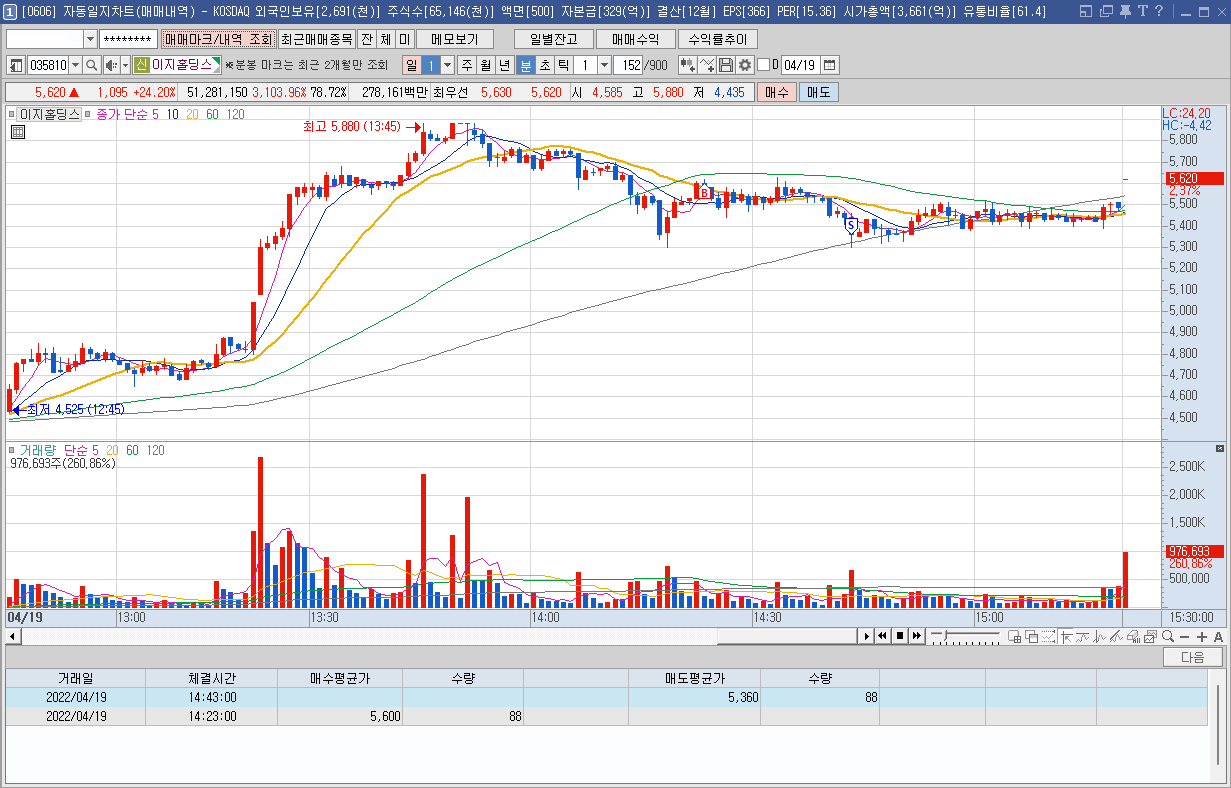 내용: 고점이라 비중을 평소에 절반만 들어갔더니 상한가를 가버렸다. 그나마도 매수 후 하락하려는 움직임에 절반은 재빠르게 손절한 상황이라 상한가를 먹었어도 수익금은 거의 동전 수준 ㅠㅠ