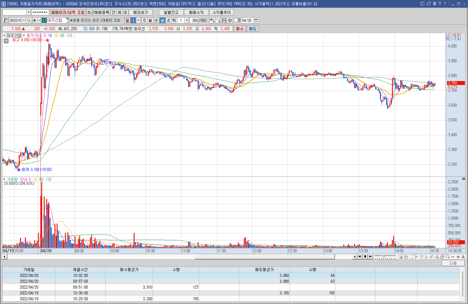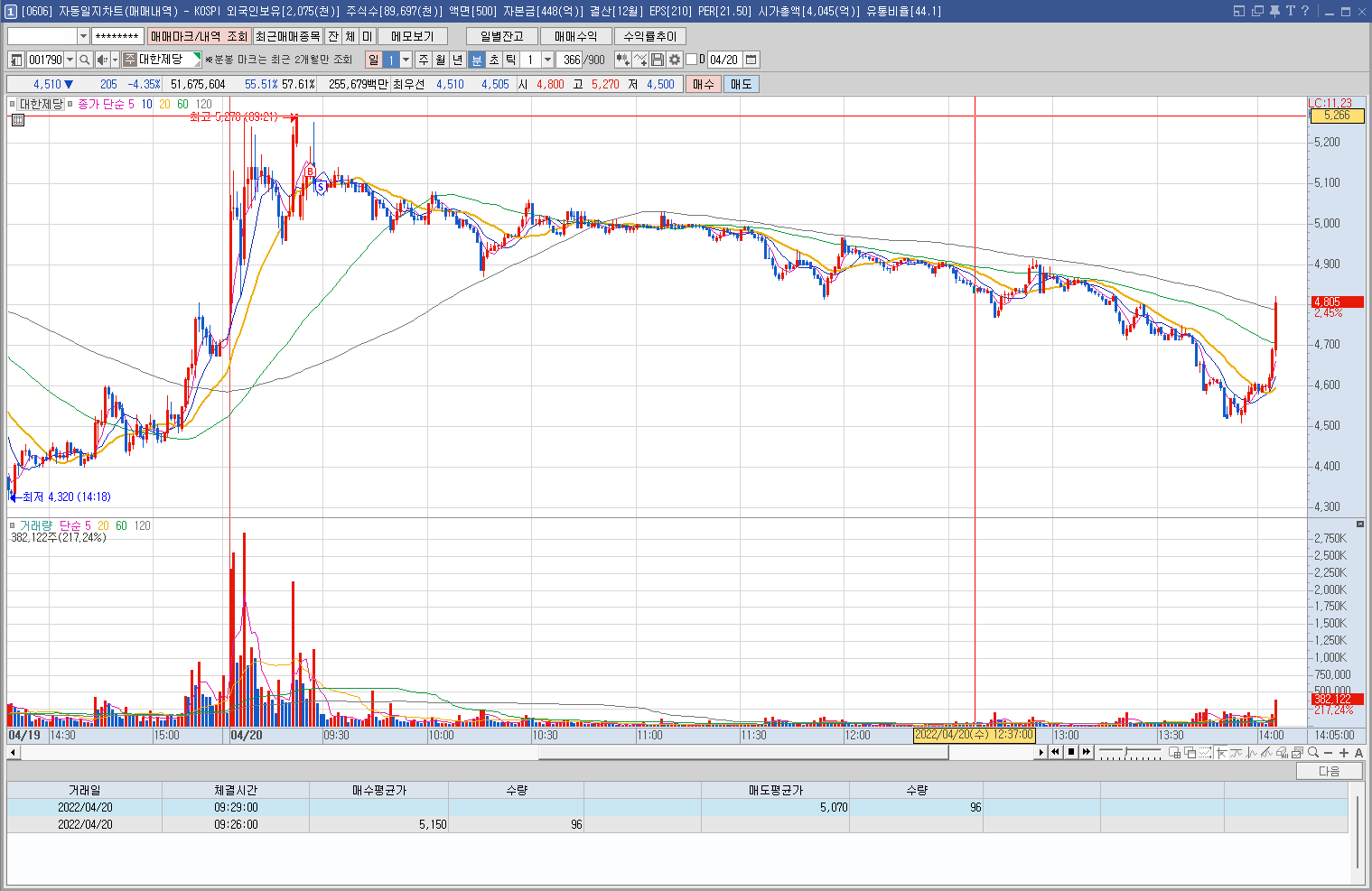 내용: 너무 고점에 접근해서였는지 20분선을 돌파 후 다시 맥없이 고꾸라지는 모습에 20분선 이탈시 바로 정리.