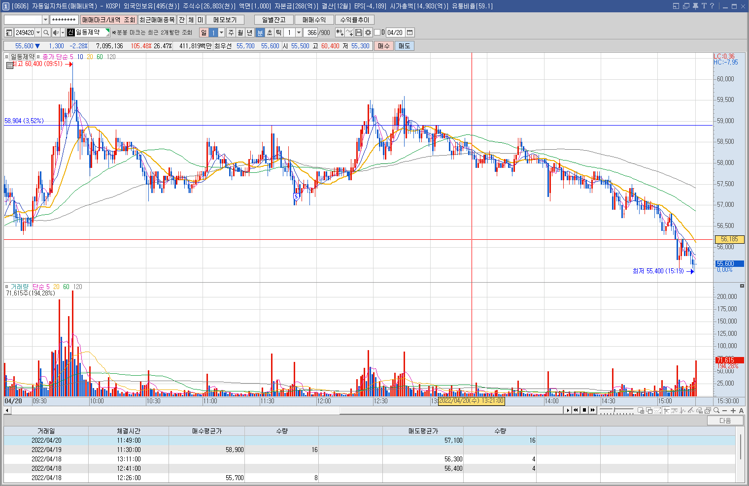 내용: 오늘도 나에게 멘붕을 선사했던 종목. 어제 약간 높긴 했지만 58,900원 라인에 매수했고, 장초반 매수가를 돌파해 강하게 치고 올라가는 모습에 어제 고점보다 살짝 낮은 6.1만원에 미리 걸어놨었으나 6.04만원까지 터치 후 그대로 하락. 다시 한번 재차 상승하려는 모습을 보여줬으나 간신히 매수가 터치 후 하락. 장중 승인이 확정됐다는 뉴스가 떴음에도 계속 하락하는 모습에 재료 소멸로 이제 하락하기만 하는걸까 하면서 팔지말지를 고민하다가 너무 빠지는 모습에 그냥 던졌더니 거기가 저점. 이후 마지막 불꽃을 태우듯 재차 상승하면서 매수가를 돌파해주는 모습에 멘붕ㅠ