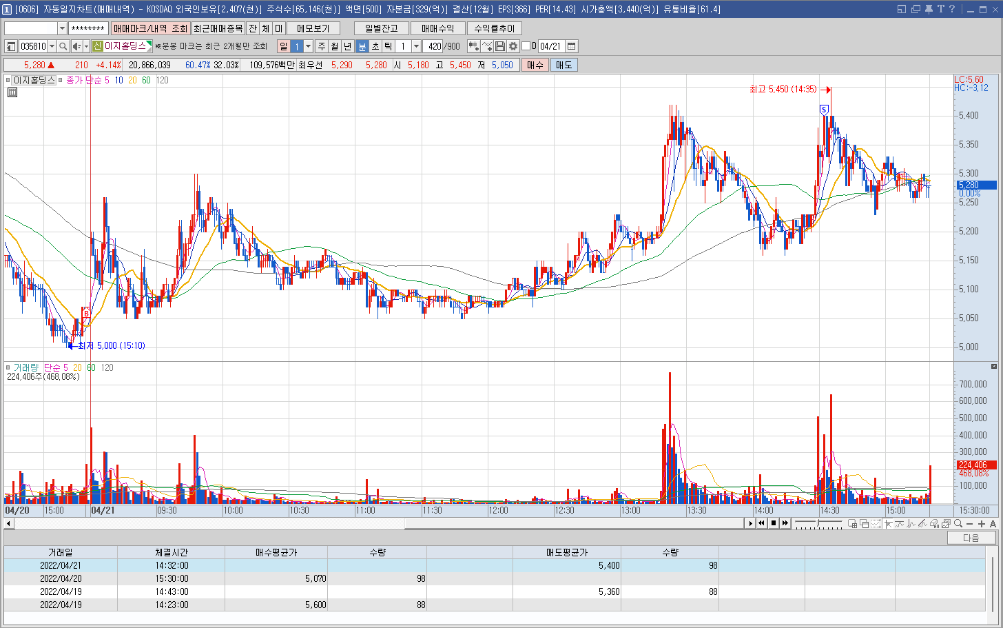 내용: 어제 종가 부근에 매수해서 오늘 정리한 종목으로 장중 내내 약한 모습에 또 잘못 선택했나 싶었지만 오후 2시 반을 넘어가면서 움직이기 시작했다. 익절할 수 있는 상황에서 자를까 말까를 고민하다가 다사 하락 반전할까 싶어 그냥 조금 먹고 정리했으나 잠시 후에 장대 양봉을 한번 뽑아주면서 결국 종가가 내 평단보다 높은 채 마감됐다. 먹긴 먹었는데 참...