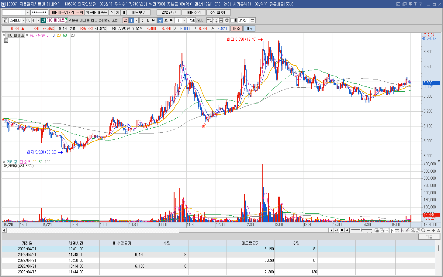 내용: 오늘 유일하게 나이스하게 매매한 종목. 솔직히 10% 정도를 보고 들어간터라 장중 내내 팔까말까를 고민하며 버티느라 힘들었다. 다행히 장중 거의 최고점에 던져서 기다린 보람이 있었다. 재차 진입하려 했으나 원하는 가격까지 오지 않아 잡진 못했다.