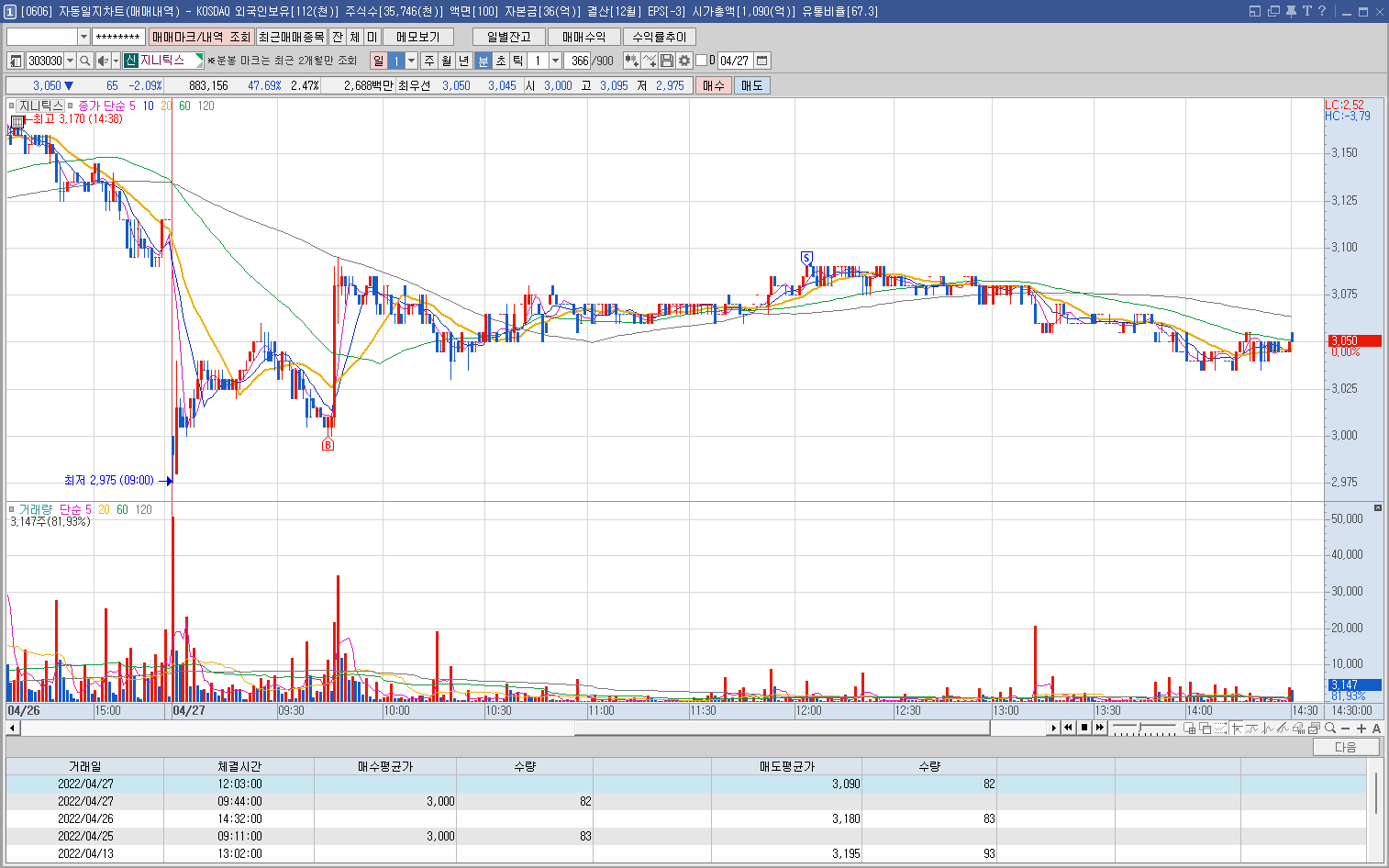 내용: 지니틱스는 나에게 단타임에도 좋은 수익을 안겨다주는 고마운 종목이다. 어제도 5%대 후반의 수익율을 줬고, 오늘도 괜찮은 수익을 안겨줬다. 게다가 장중 거의 최저점에 매수해서 오늘 거의 정수리에서 매도했다. 매일 이렇게만 매매되면 얼마나 좋을까?