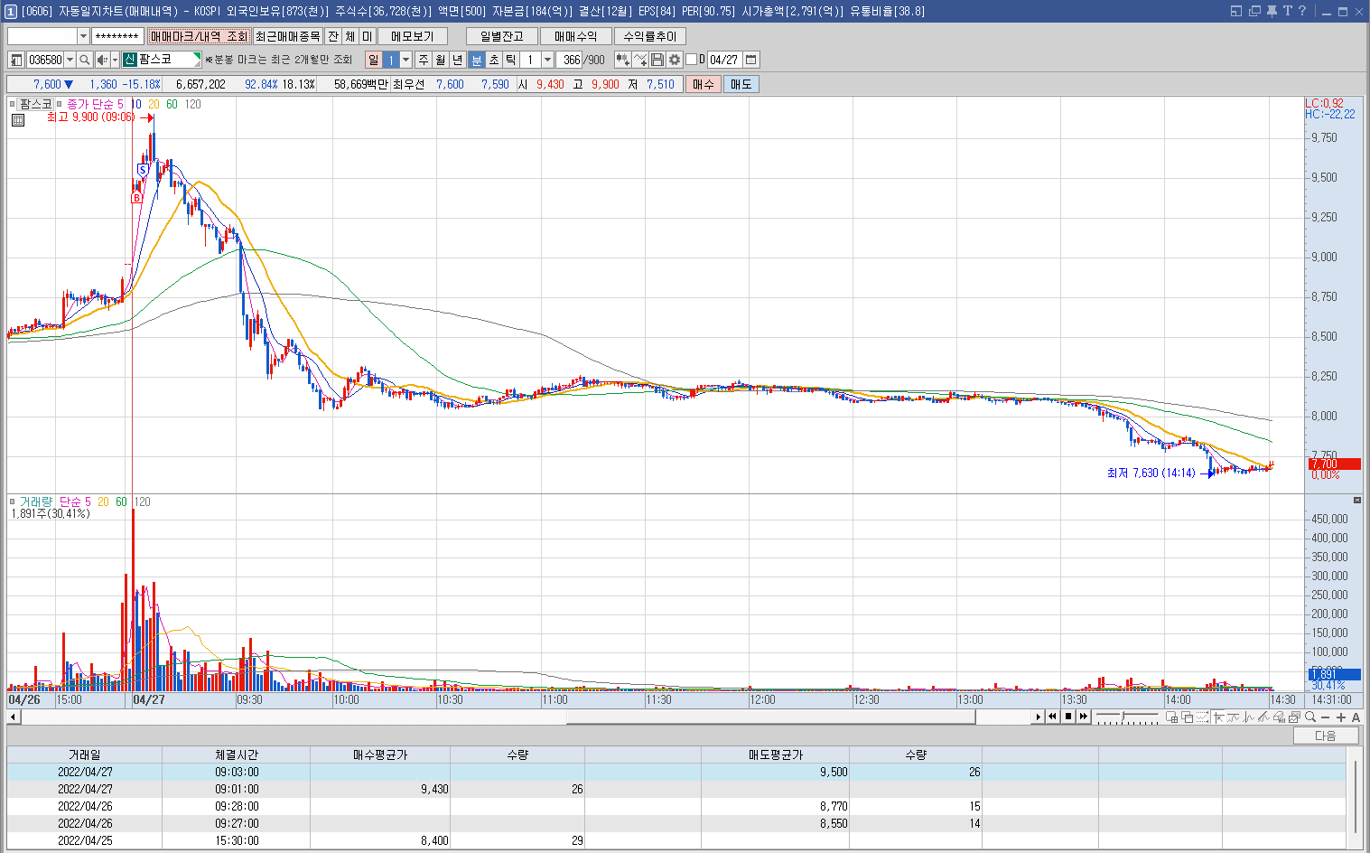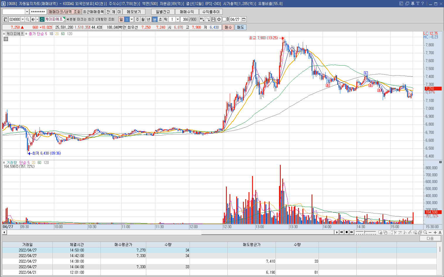 내용: 세차하고 들어와서 다시 HTS를 켠 후 처음 눈에 들어온 종목으로 장중 변동폭이 너무 커 들어갈지 고민했는데 상승 추세를 이어가다 갑자기 급락하는 모습에 직전 저점에 구간에 다가왔을 때 진입. 짧게 먹고 빠졌다. 변동폭이 너무 커 오래 버틸 수는 없었다. 더 급락할 수도 있으므로.