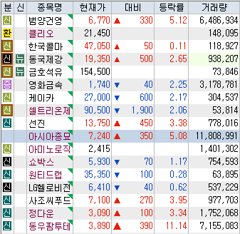 오늘은 딱히 매매한 종목들은 없었으나 화장품주가 잠시 쉬어가는 듯 보여 한 종목 매수 후 추이를 지켜보려 한다. 물론 나름의 손절 라인은 있어 이탈시 자를 예정이다. 어제 약 500 종목 정도 훑어보며 오늘 갈 수 있는 종목들이 뭐가 있을지 체크해뒀었다. 그 중 절반 이상은 상승하는 모습을 보였고, 2 종목 이상은 10% 이상 상승하는 모습을 보여주기도 했다.