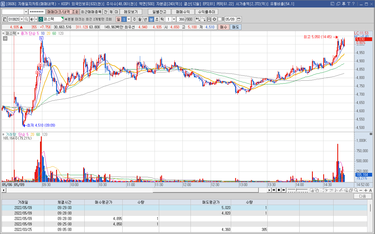 매수 사유: 장전에 나름대로 분석한 기선제압의 매매법을 적용하여 초이스한 종목