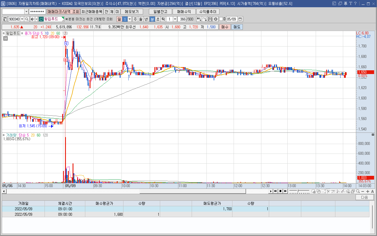 내용: 장전에 미리 초이스한 종목으로 정전에 미리 시초가 매수로 걸어놓고 진입. 진입한 1분봉에 윗꼬리가 길게 달리는 모습에 바로 정리.