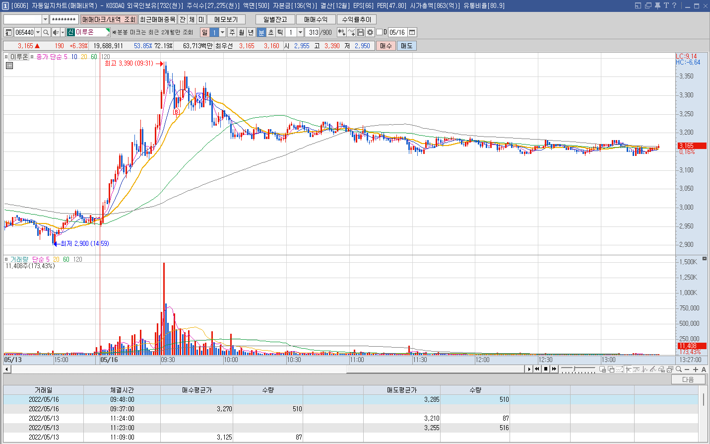 내용: 오후장은 매매를 하지 않으려고 했으나 재료를 달고 있는 상태에서 강한 모습을 지속적으로 유지해주는 모습에 진입. 3차례 매매에서 모두 익절. 마지막 3차 매매는 매도를 미리 걸어놓고 있었는데 머리를 지켜든 상황에서는 그냥 지켜볼걸 하는 아쉬움이 좀 남았다.