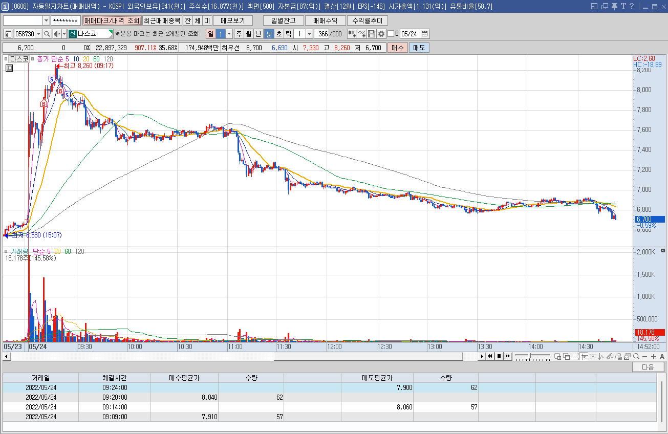 내용: 장초반 들어갔다가 소액 익절하고 다시 다 뱉어냈다. 얘는 그래도 신속하게 손절해서 그나마 큰 손실은 막을 수 있었다.