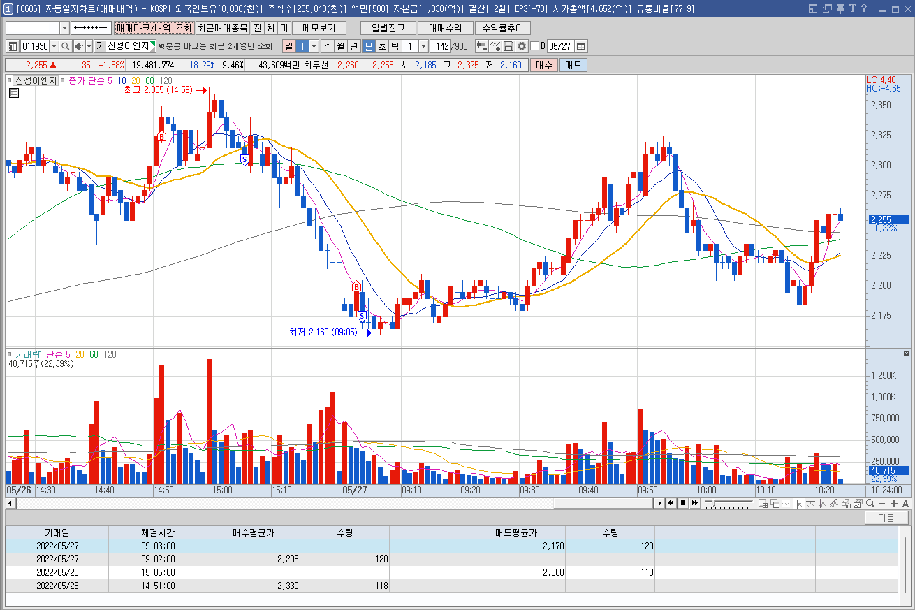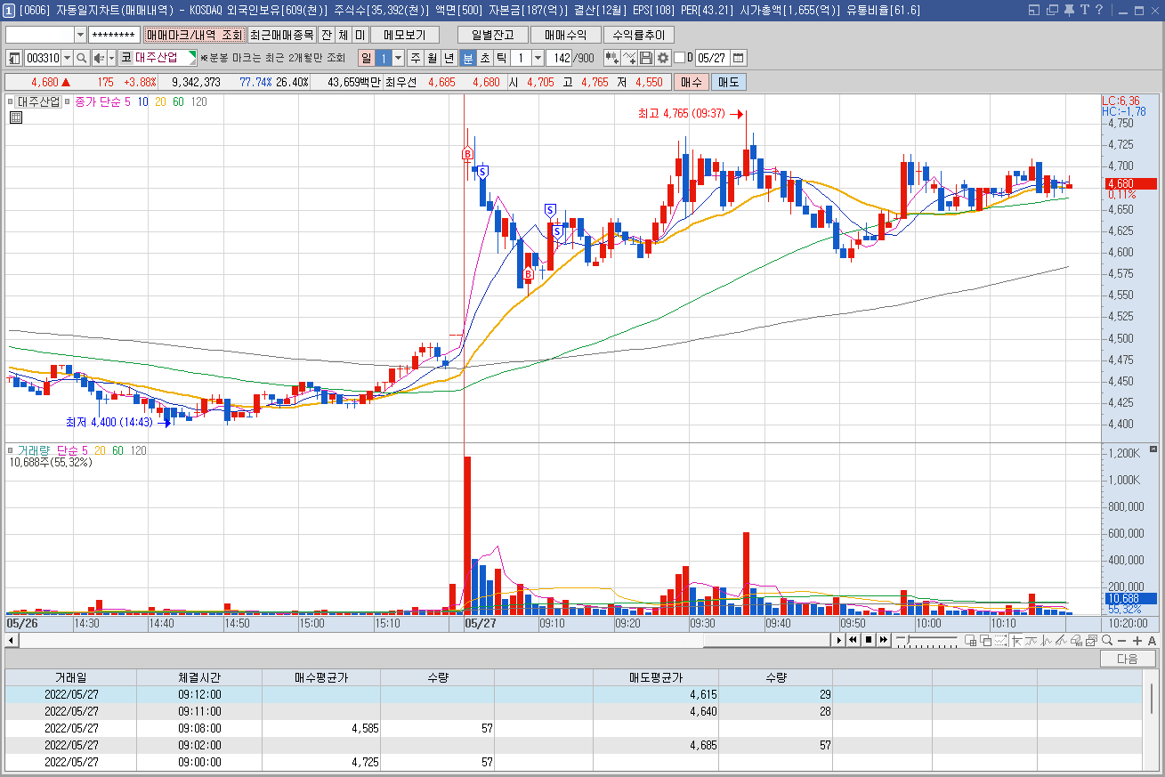 내용: 이것도 장초반 돌파 때 진입했는데 거래가 미미한 탓에 언제라도 다시 하락시킬 것 같은 모습에 1차는 거의 본절에 가까웠고, 예상과 다르게 거래가 붙으며 다시 상승하는 모습을 보이길래 진입했으나 페이크였던 듯ㅠㅠ