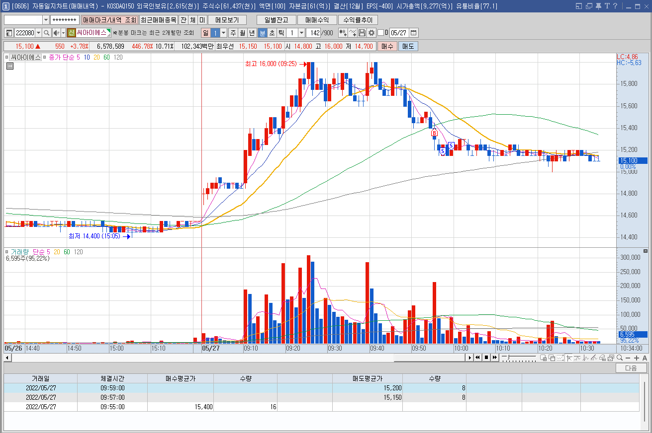 매수 사유: 전일 특징주로 240일선을 이탈하지 않는 모습에 장전에 미리 선별한 종목.