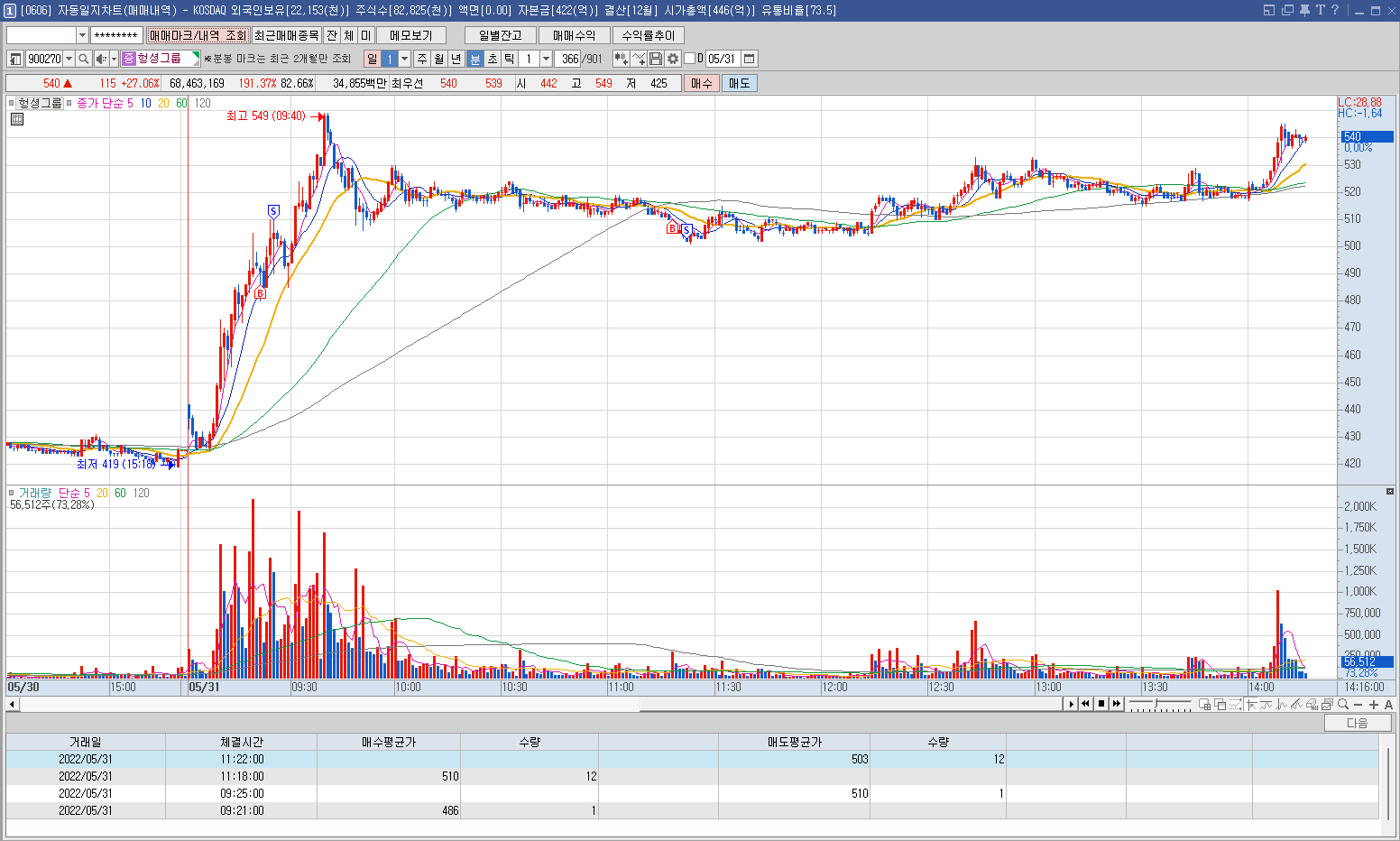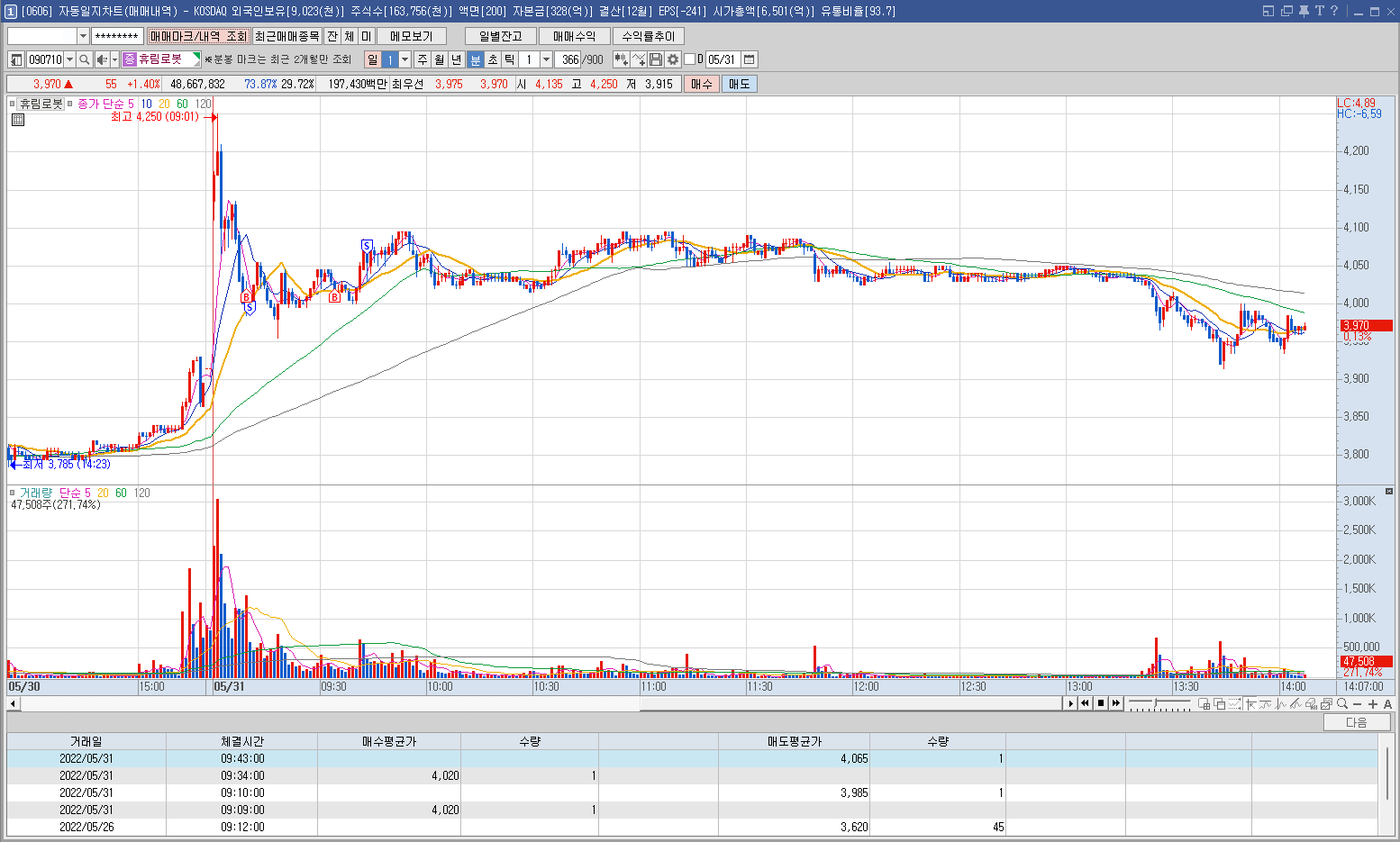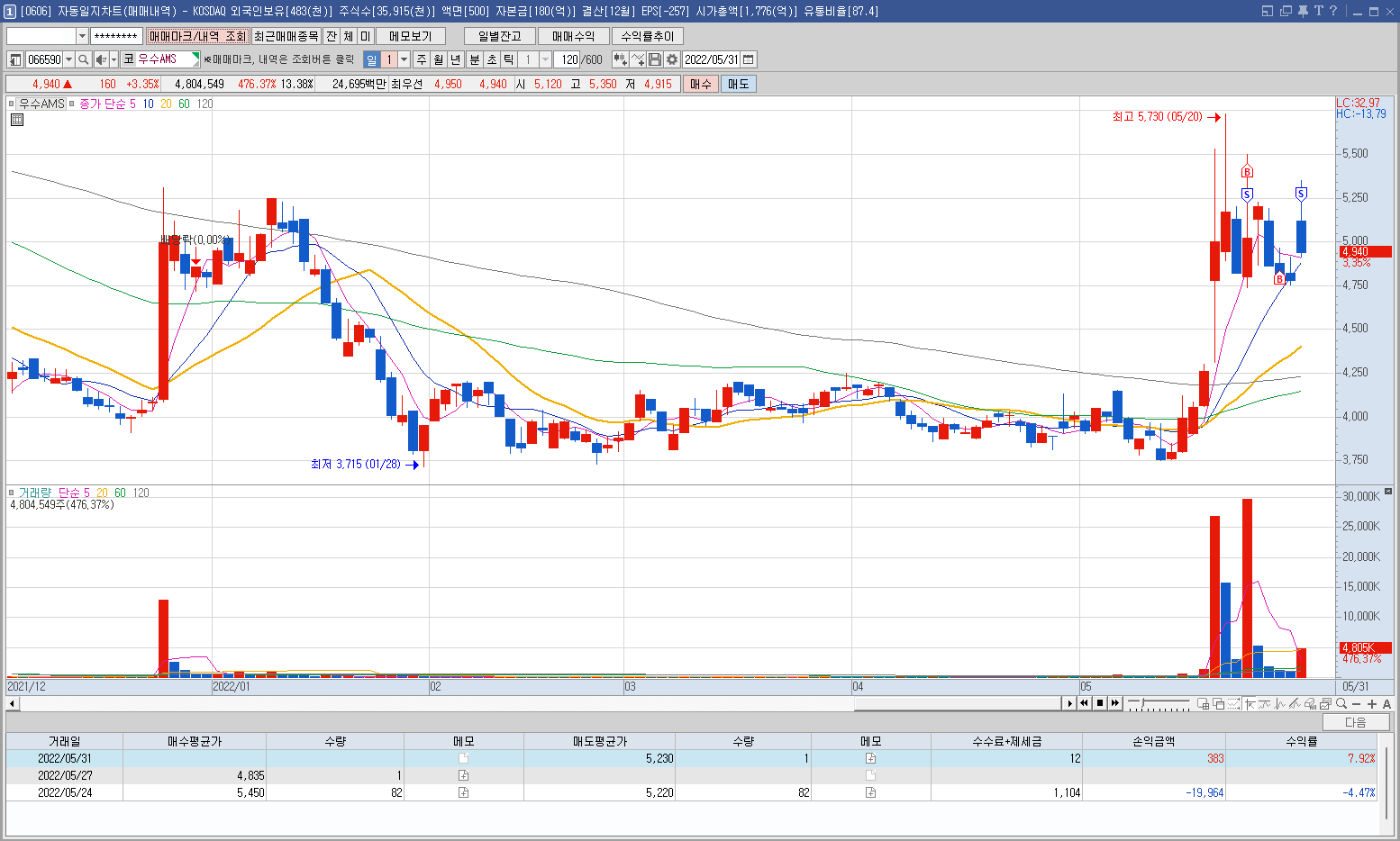 내용: 어제 일지에 기록한 종목으로 지난주 금요일 장 막판에 들어갔다가 4750원을 이탈하면 손절할 생각으로 진입했는데 어제 다행히 이탈되지 않고 오늘 시초부터 급등하는 모습에 바로 정리해서 수익했다. 욕심을 더 부리지 않아 많이 먹을 수 있었다.