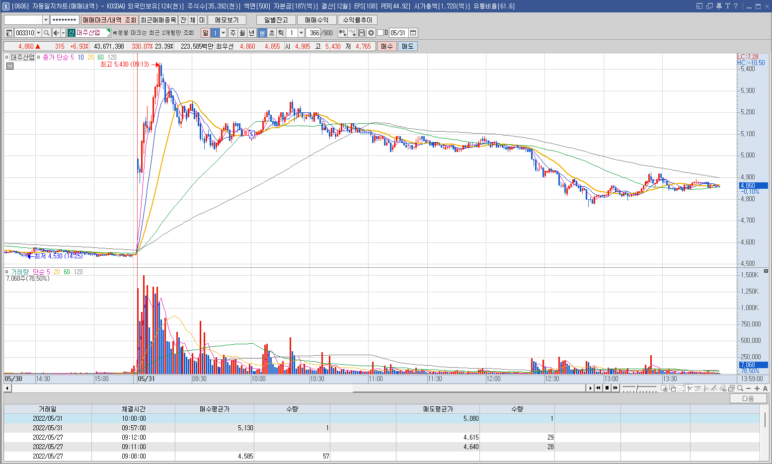 내용: 어제 일지에 기록한 종목으로 지난주 금요일 장 막판에 들어갔다가 4750원을 이탈하면 손절할 생각으로 진입했는데 어제 다행히 이탈되지 않고 오늘 시초부터 급등하는 모습에 바로 정리해서 수익했다. 욕심을 더 부리지 않아 많이 먹을 수 있었다.