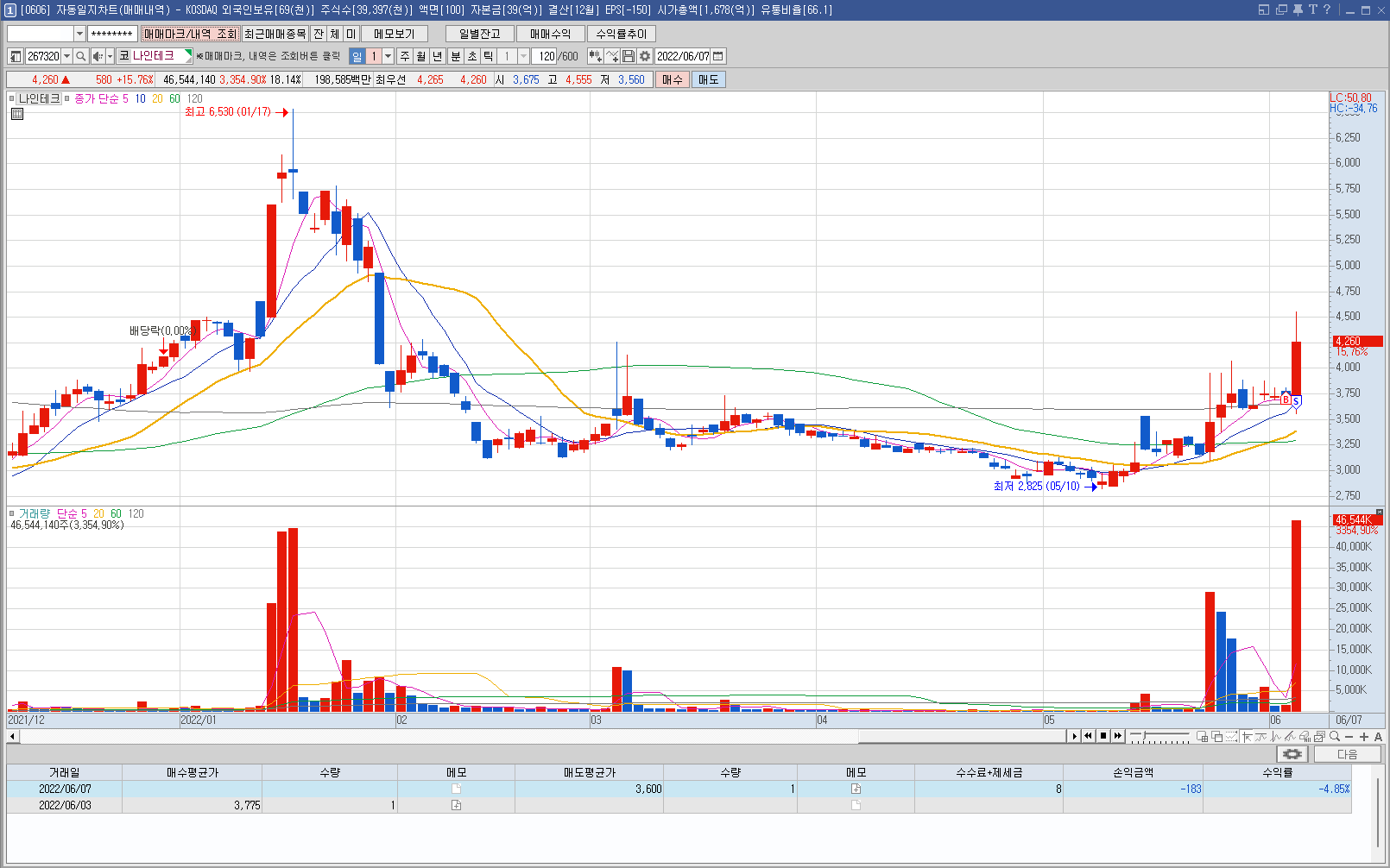 내용: 생각대로 더 상승해주지 못하고 다시 하락하는 모습에 손절. 손절 타이밍이 너무 늦었다. 바로 위에 관심종목으로 체크해놨던 퍼스텍을 매매했더라면 크게 먹었을텐데 종목 선정이 참 아쉬웠다.
