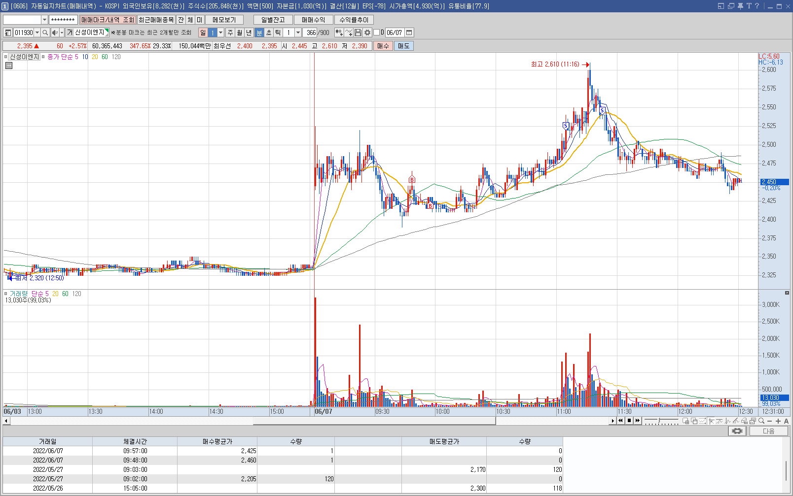 내용: 장전에 주봉을 보고 저항이라고 판단되는 라인에 2개의 선(2400원, 2540원)을 그렸고 그 사이에서 시가를 형성할 것으로 보여 보고 있었던 종목이다. 장 시작 후 2540원 근처까지 갔다가 하락했고 2400원 선에서 다시 반등하는 모습에 1차로 1분봉상 20선을 돌파할 때 1차 매수, 눌릴 때 2차 매수한 후, 다시 반등하는 모습에 직전 고점 라인에 1차 매도, 2540원까지 하락하는 모습에 전량 매도했다.