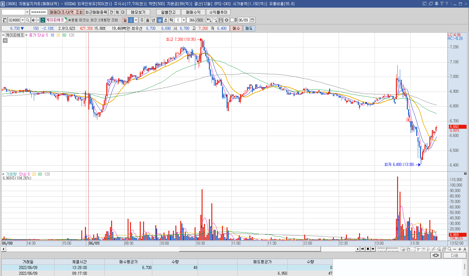 내용: 어제 시초에 갭을 크게 띄워 출발하면서 240일선을 돌파하고 며칠전에 이어 어제도 거래량이 터지는 모습에 흐름을 지켜보고 있다가 점점 하락하며 240일선을 재차 터치하는 모습에 1차 매수, 직전 고점에 2차 매수하며 지켜보고 있다가 오늘 시초부터 급등 출발하는 모습에 원래는 매도가를 걸어놓고 털려고 했는데 실수로 시장가에 던져졌는데 운이 좋게도 거기가 오늘 최고점이 됐다. 그래서 운좋게 1차 분할매도는 성공적이었는데 이후 다시 크게 반등하지 못하고 흐르는 모습에 직전 저점에 다 털어버렸다. 실수였지만 이번에 기분좋은 실수였다.